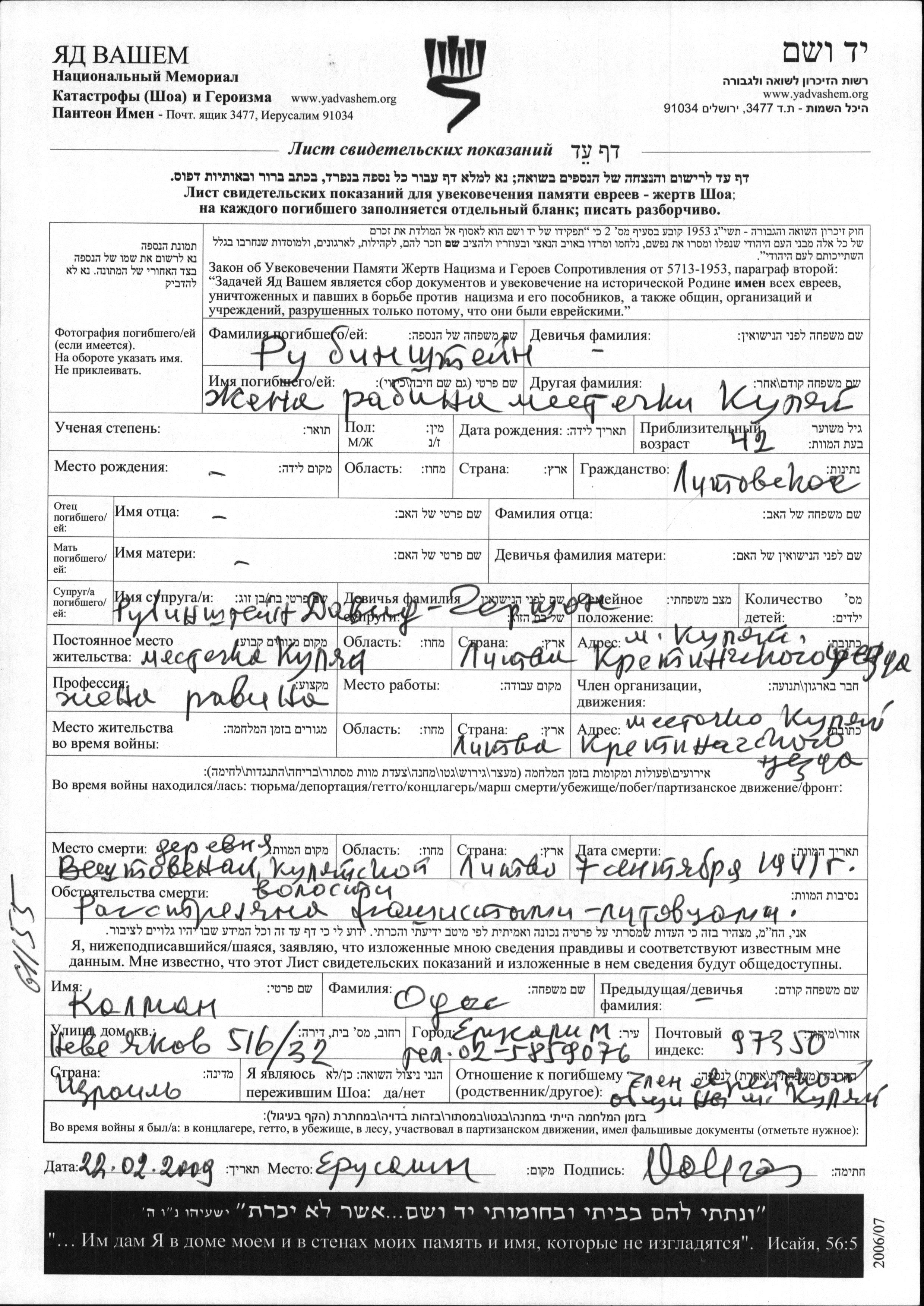 Яд Вашем - Листы свидетельских показаний Мемориального фонда