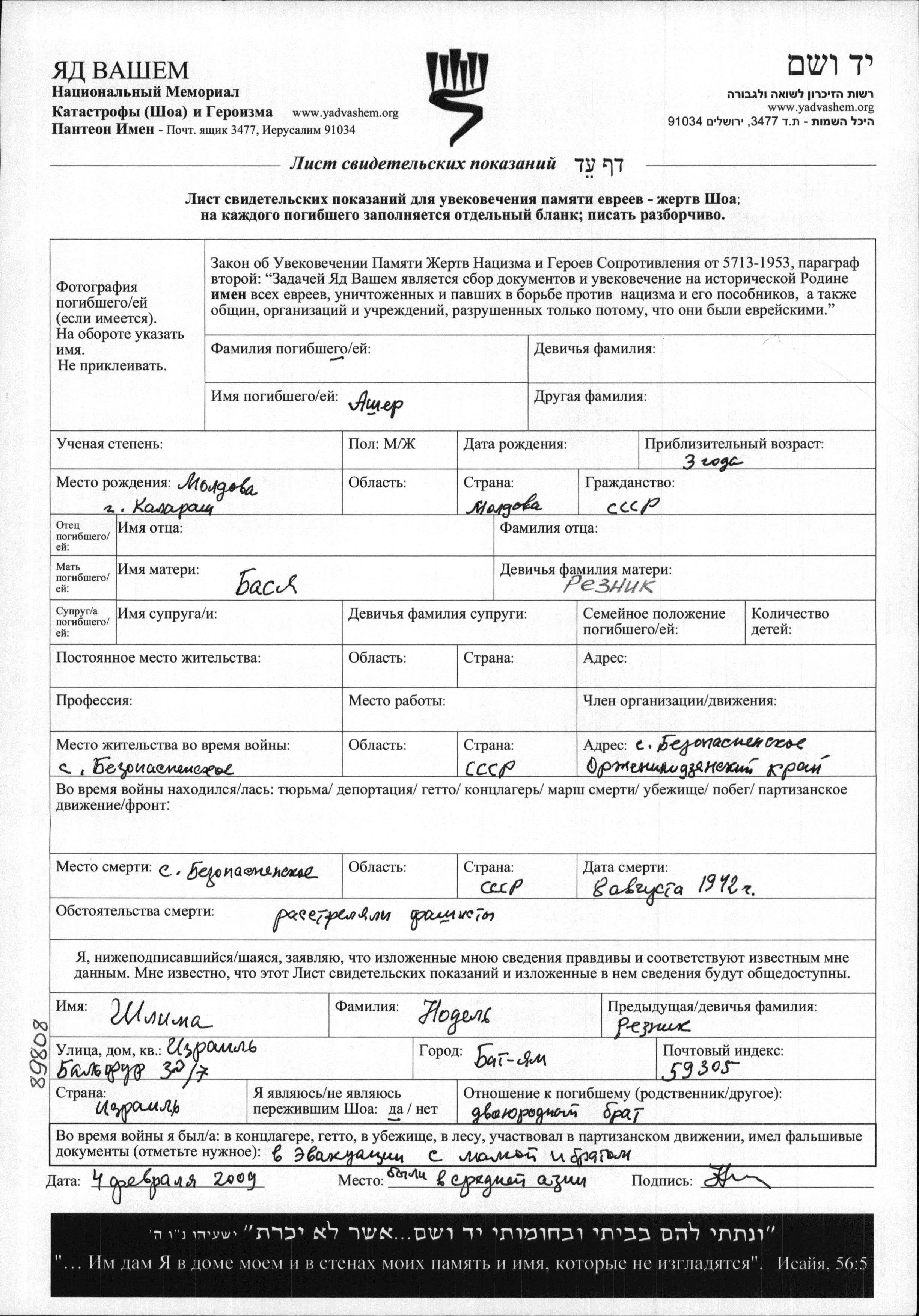 Ашер Фамилия неизвестна, место рождения: Калараш, Румыния.Mать:Бася, девичья фамилия Резник. Ребенок. Место во время войны: Безопасное, Россия (СССР).