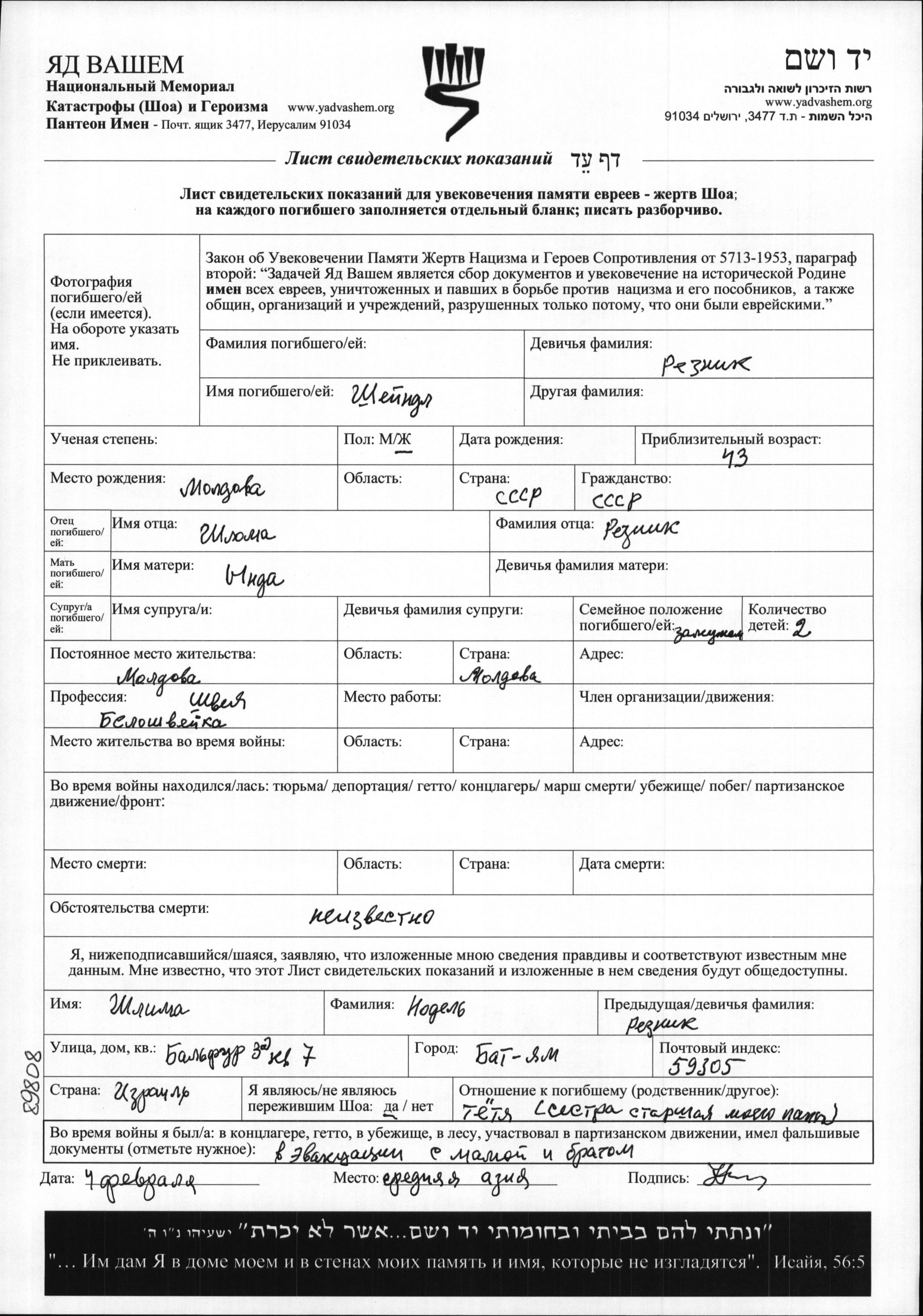 Шейндл Фамилия неизвестна, девичья фамилия Резник, место рождения: Молдавия, Румыния. Отец: Шлома, mать:Инда. Shveya russian. Женат / замужем. Место жительства до войны: Молдавия, Румыния.