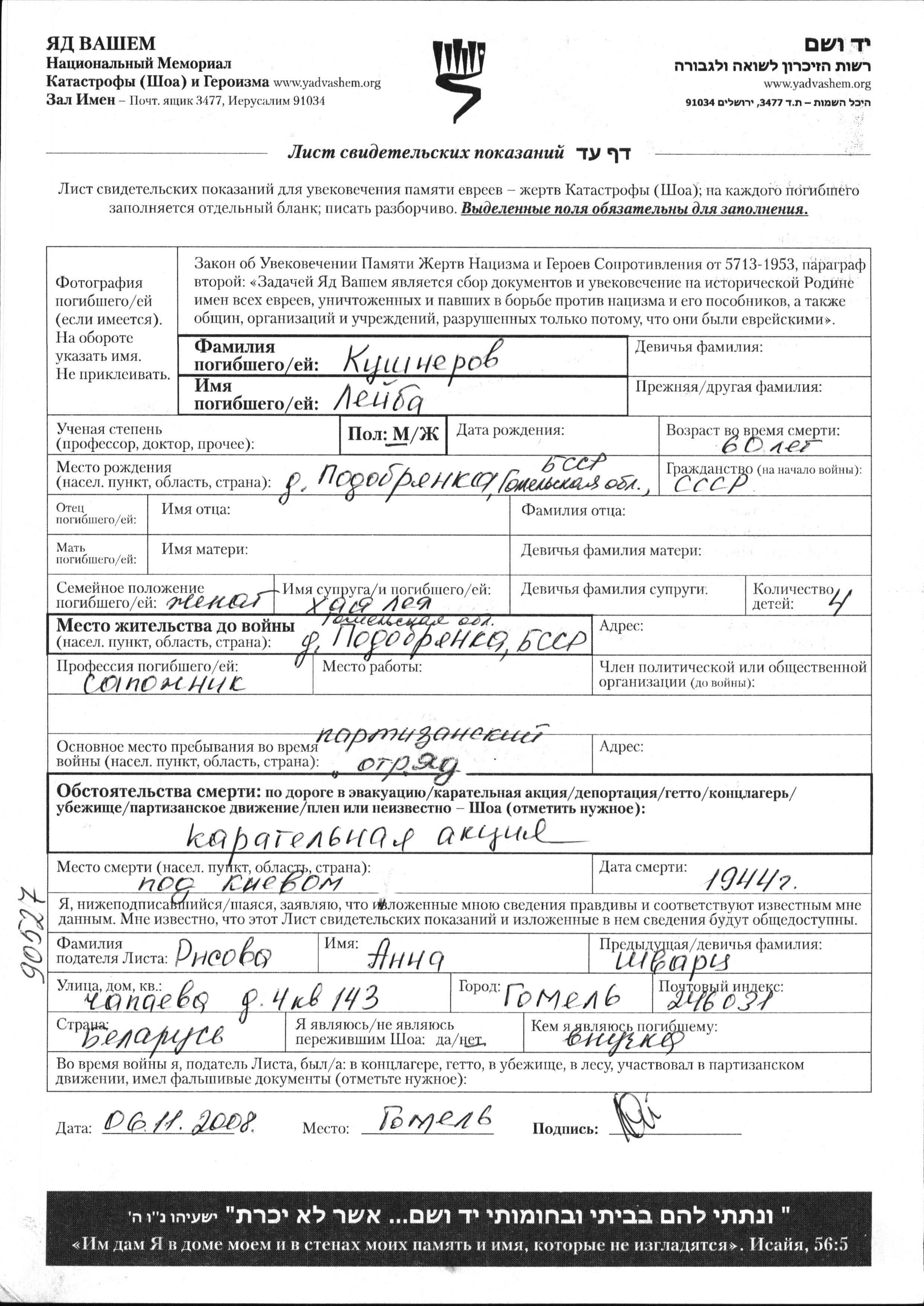 Кушнеров Лейба Поддобрянка, Белоруссия (СССР) Лист свидетельских показаний