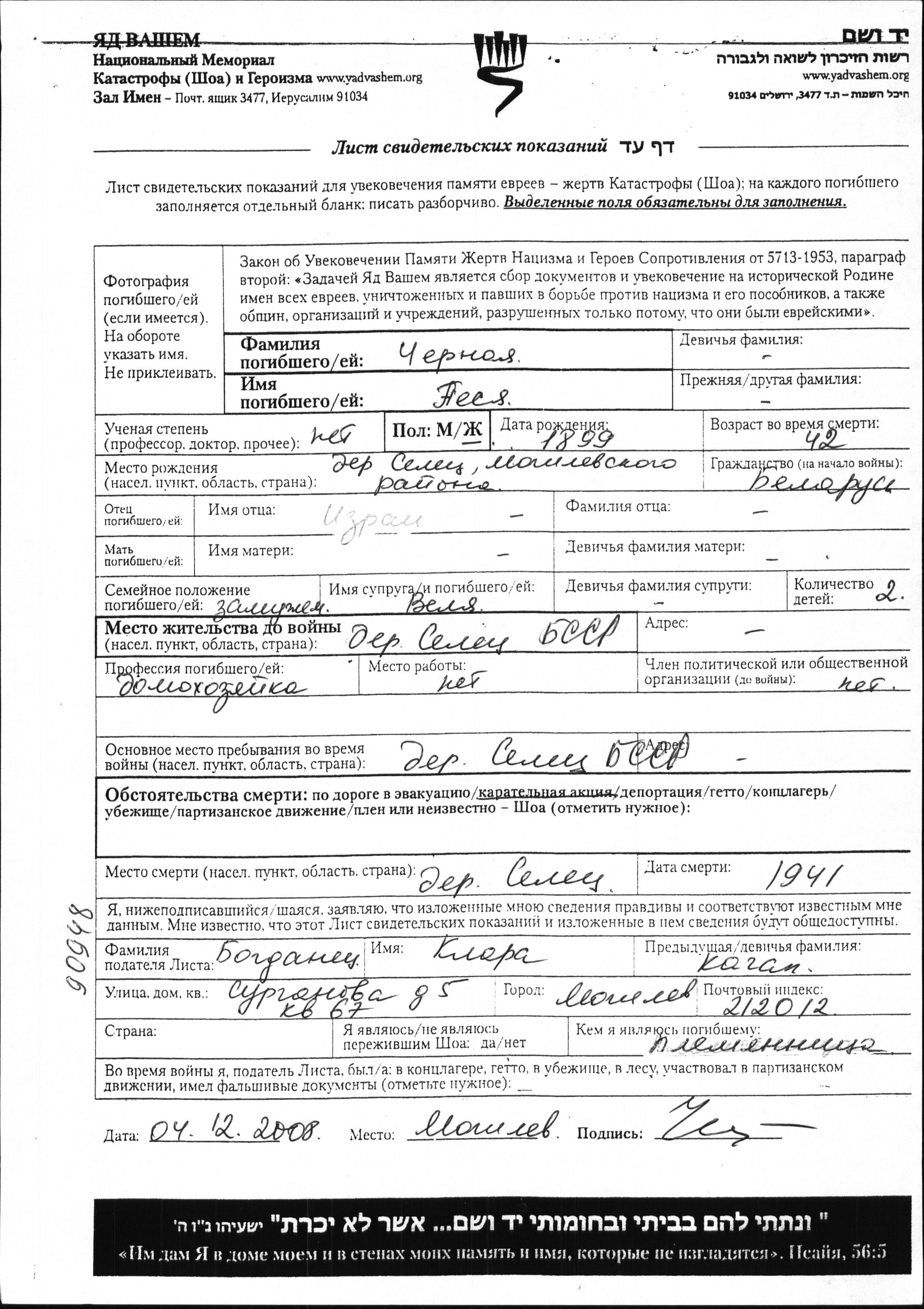 Яд Вашем - Листы свидетельских показаний Мемориального фонда