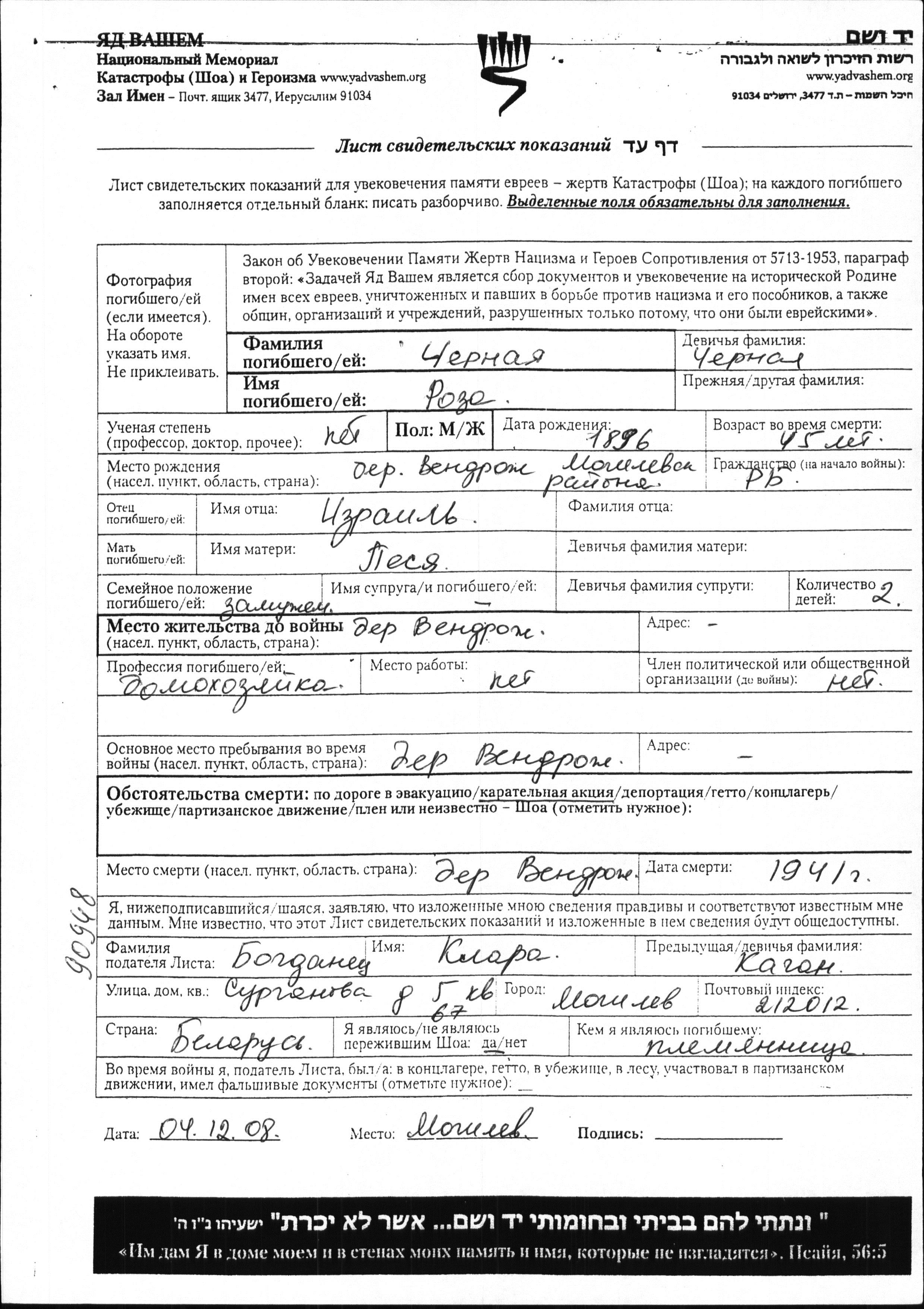 Роза Черная, девичья фамилия Черная, место рождения: Вендриж, Белоруссия (СССР). Отец: Израиль, mать:Песя. Домохозяйка. Женат / замужем. Место жительства до войны: Вендриж, Белоруссия (СССР). Место во время войны: Вендриж, Белоруссия (СССР).