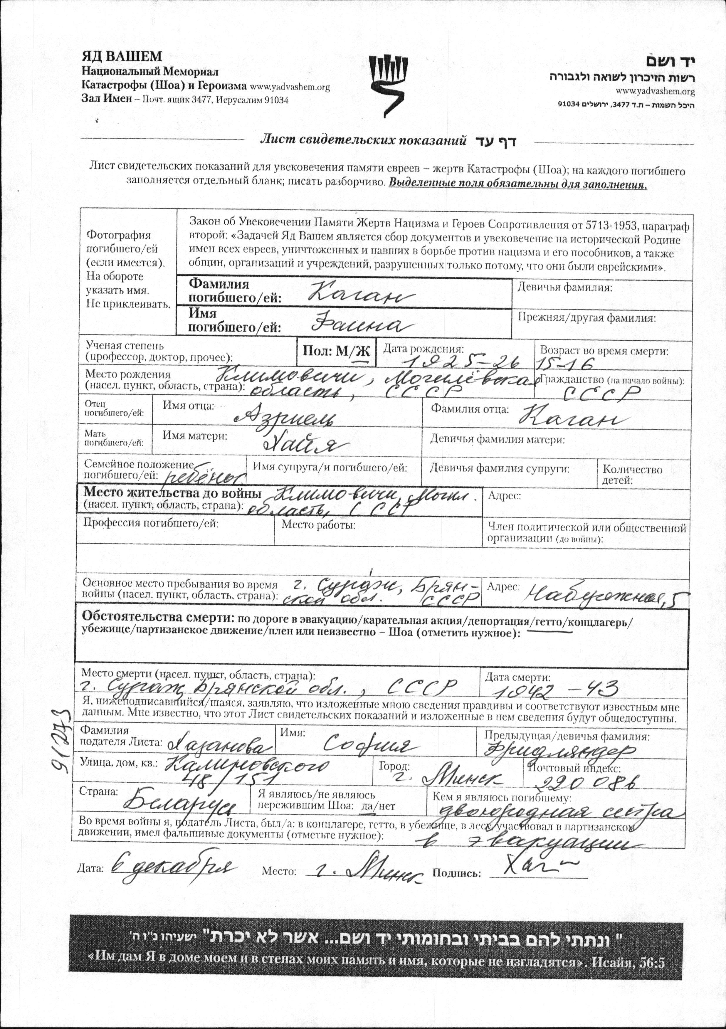Каган Фаина 1925 Климовичи, Белоруссия (СССР) Лист свидетельских показаний