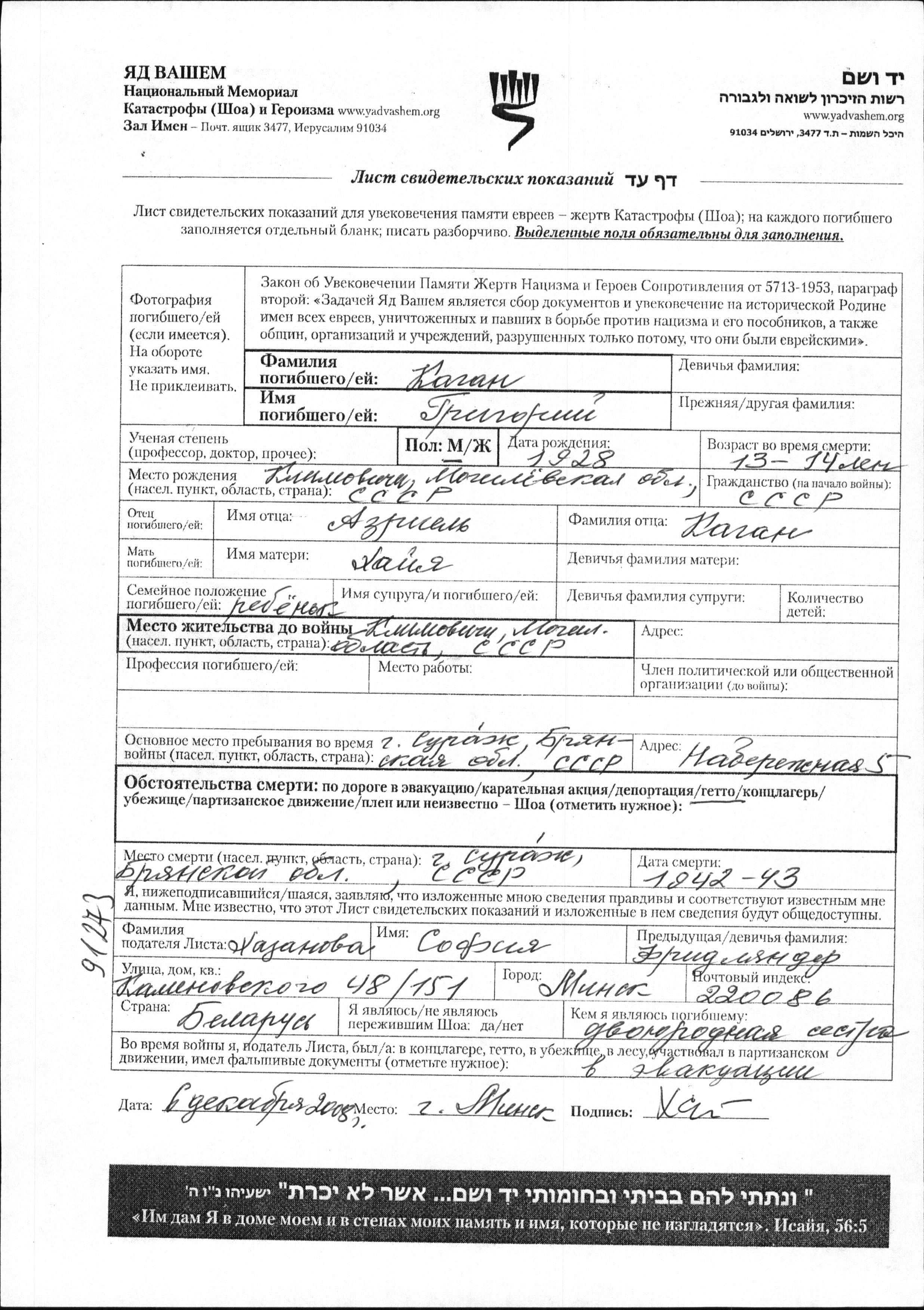 Каган Григорий 1928 Климовичи, Белоруссия (СССР) Лист свидетельских показаний
