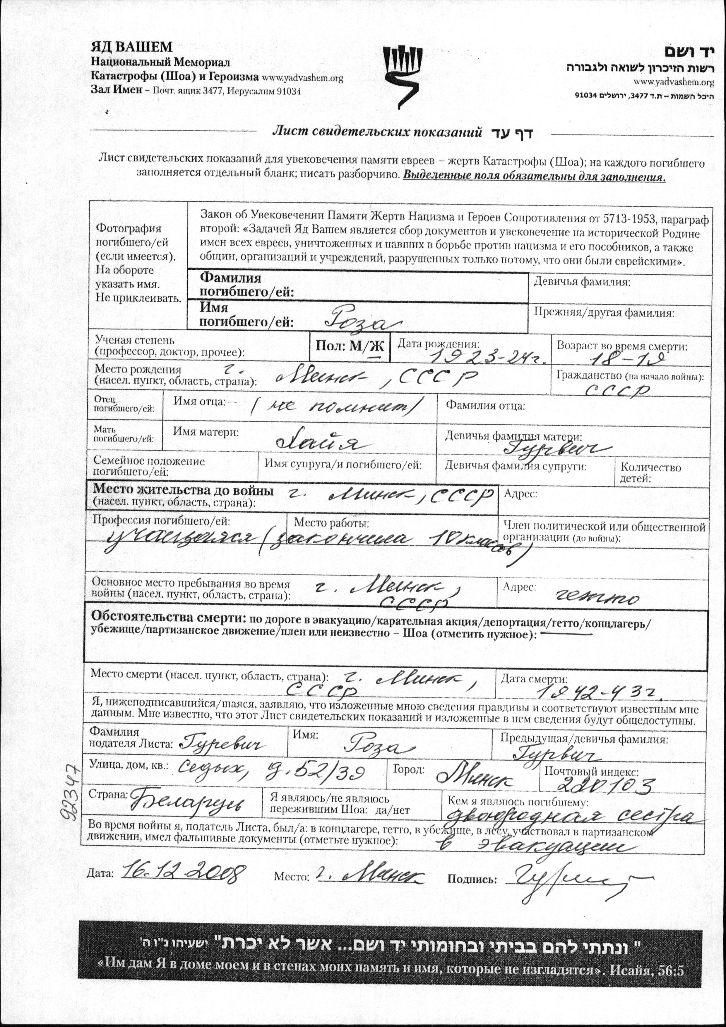 Фамилия неизвестна Роза 1923 Минск, Белоруссия (СССР) Лист свидетельских показаний