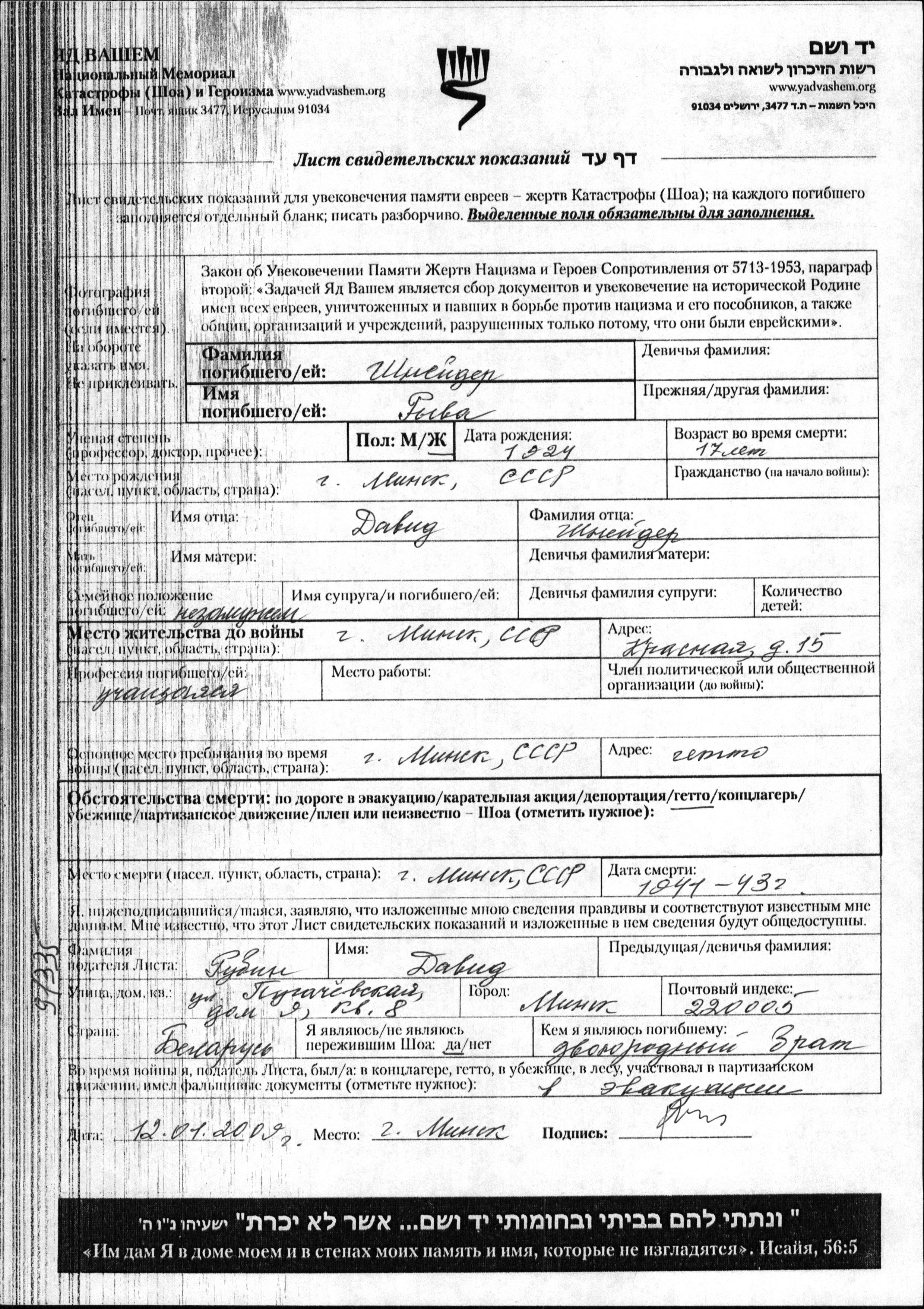 Рыва Шнейдер, место рождения: Минск, Белоруссия (СССР). Отец: Давид. Учащаяся. Подросток. Место жительства до войны: Минск, Белоруссия (СССР). Место во время войны: Минск, Белоруссия (СССР). Рыва уничтоженa в период Шоа. место смерти: Минск, Белоруссия (СССР).