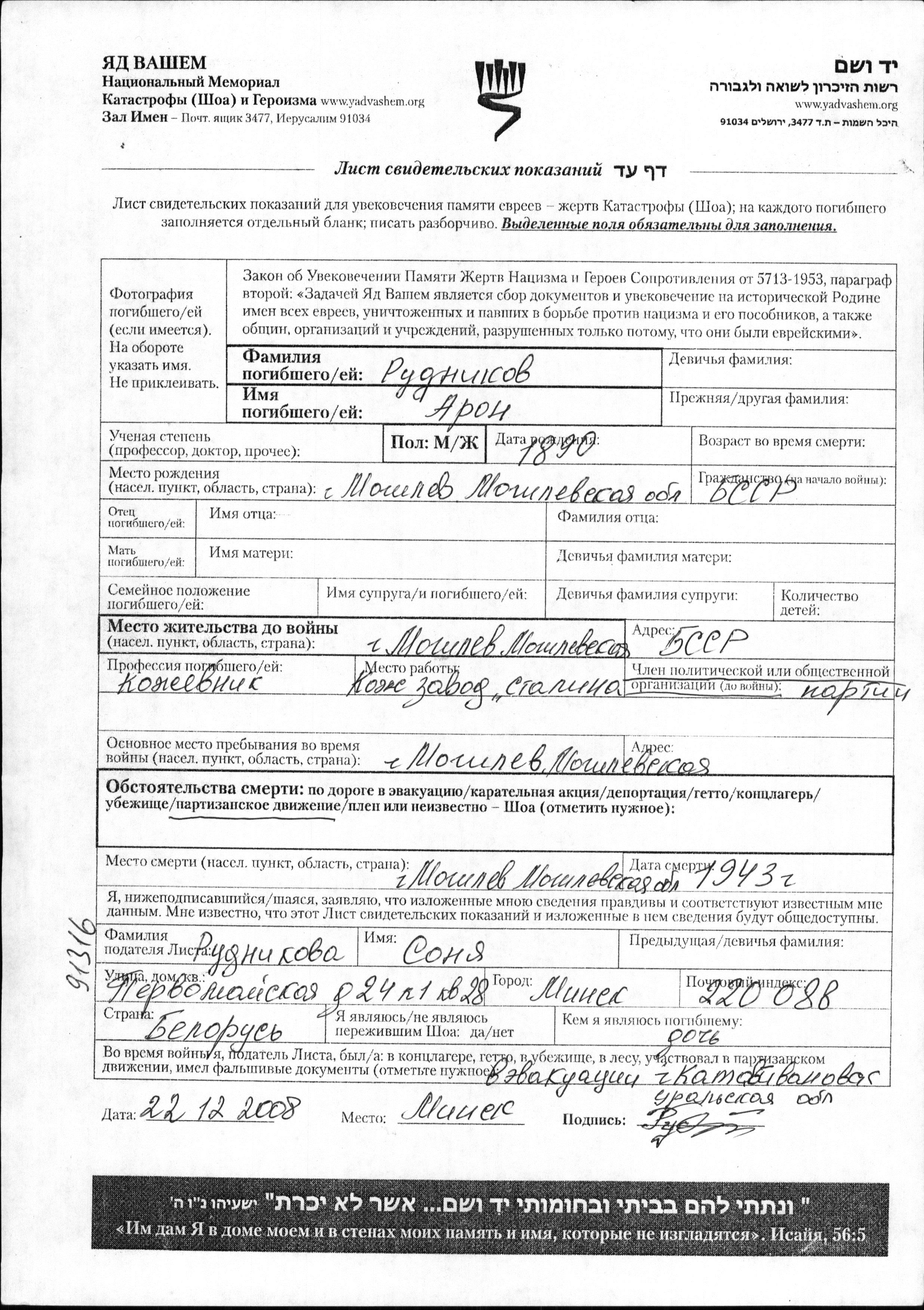 Рудников Арон 1890 Могилёв, Белоруссия (СССР) Лист свидетельских показаний