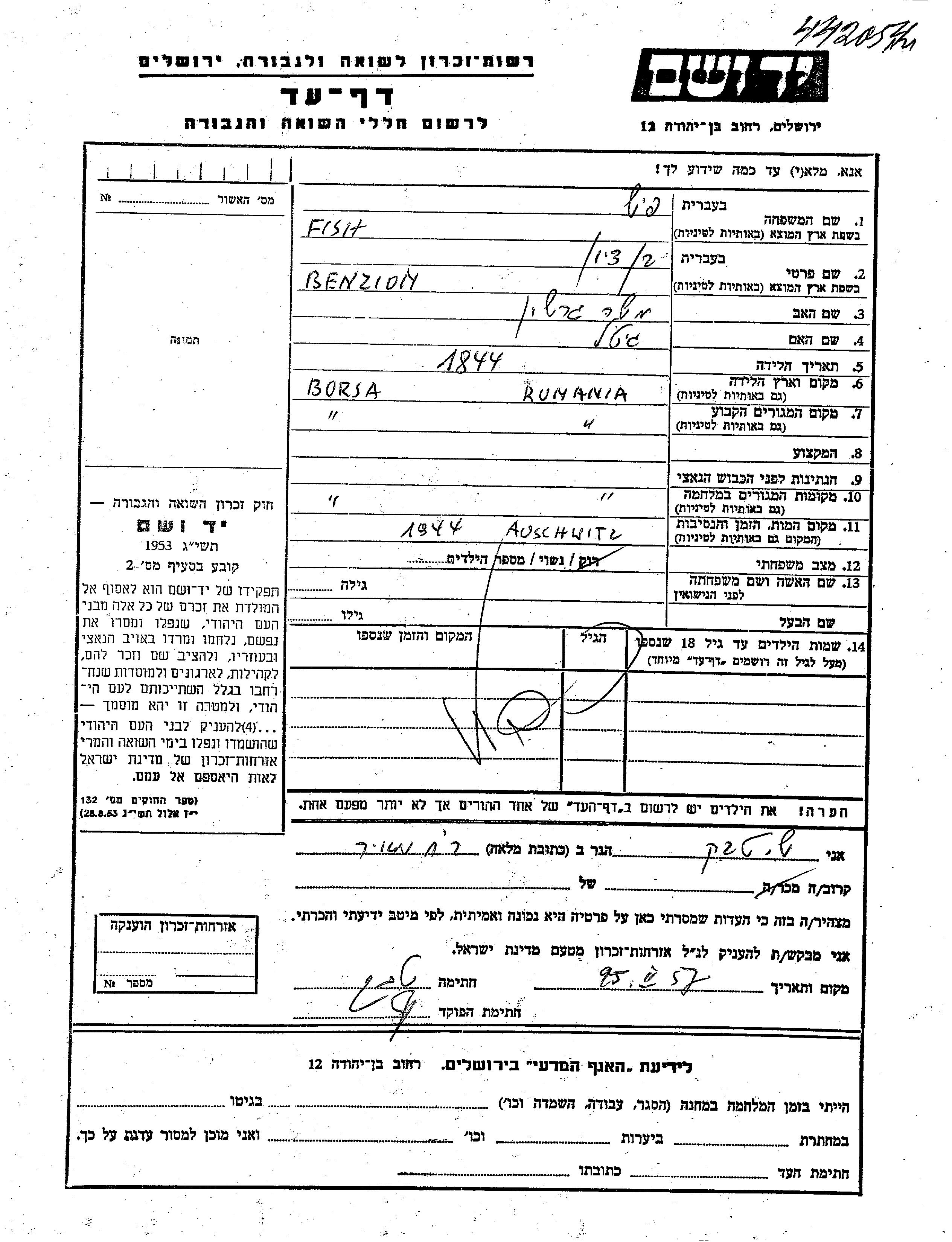 Бенцион Фиш, место рождения: Борша, Румыния. Отец: Моше Гершон, mать:Гитель. Женат / замужем. Место жительства до войны: Борша, Румыния. Место во время войны: Борша, Румыния.