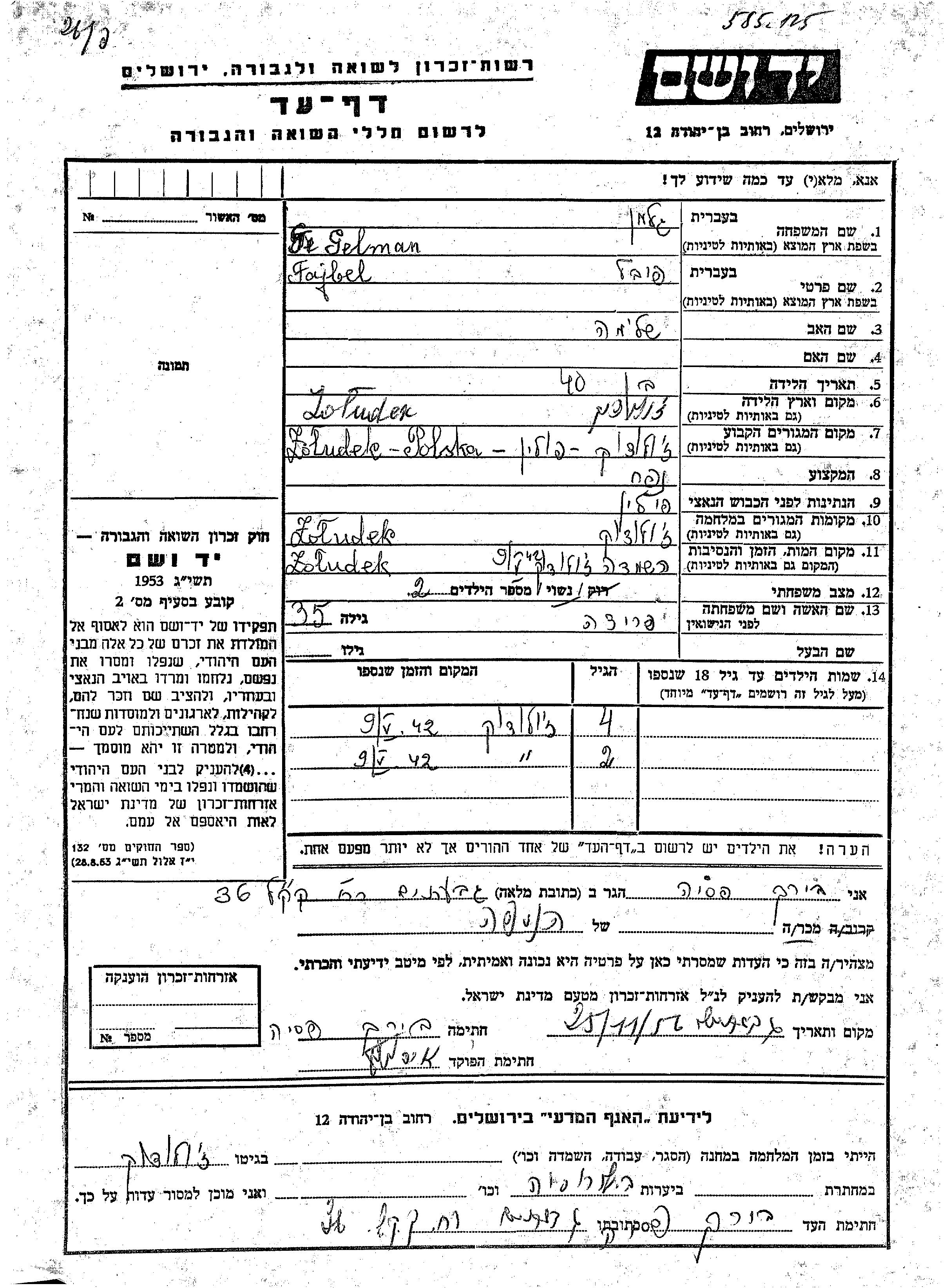 Файбель Гельман, место рождения: Желудок, Польша. Отец: Шлима. Кузнец. Женат / замужем. Место жительства до войны: Желудок, Польша. Место во время войны: Желудок, Польша.