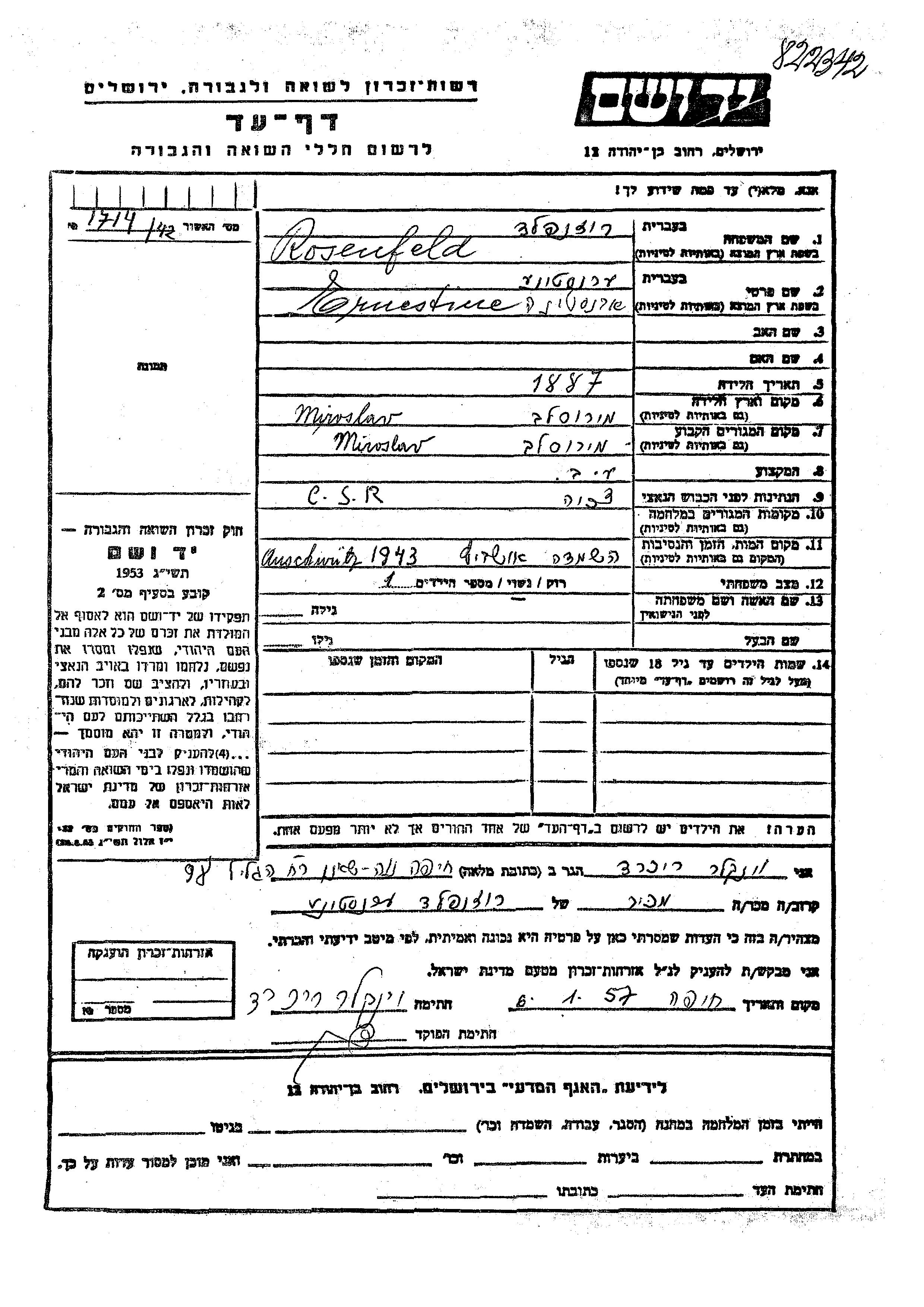 Розенфельд Эрнестине 1887 Мирослав, Чехословакия Лист свидетельских показаний
