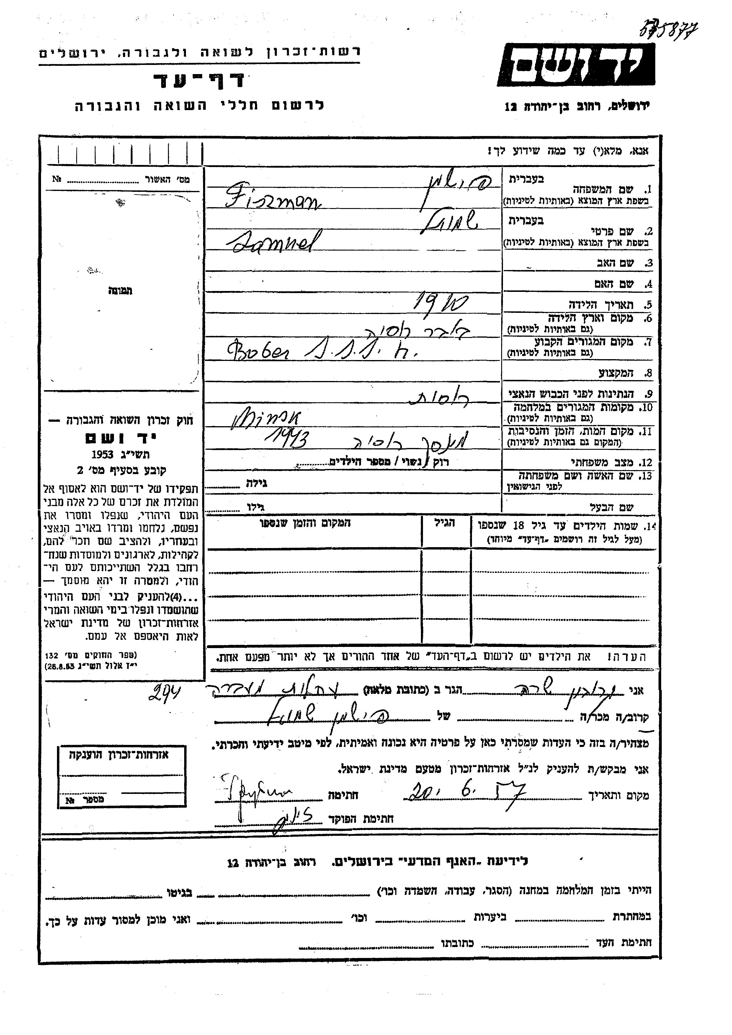 Фишман Шмуэль 1910 Бобёр, Белоруссия (СССР) Лист свидетельских показаний