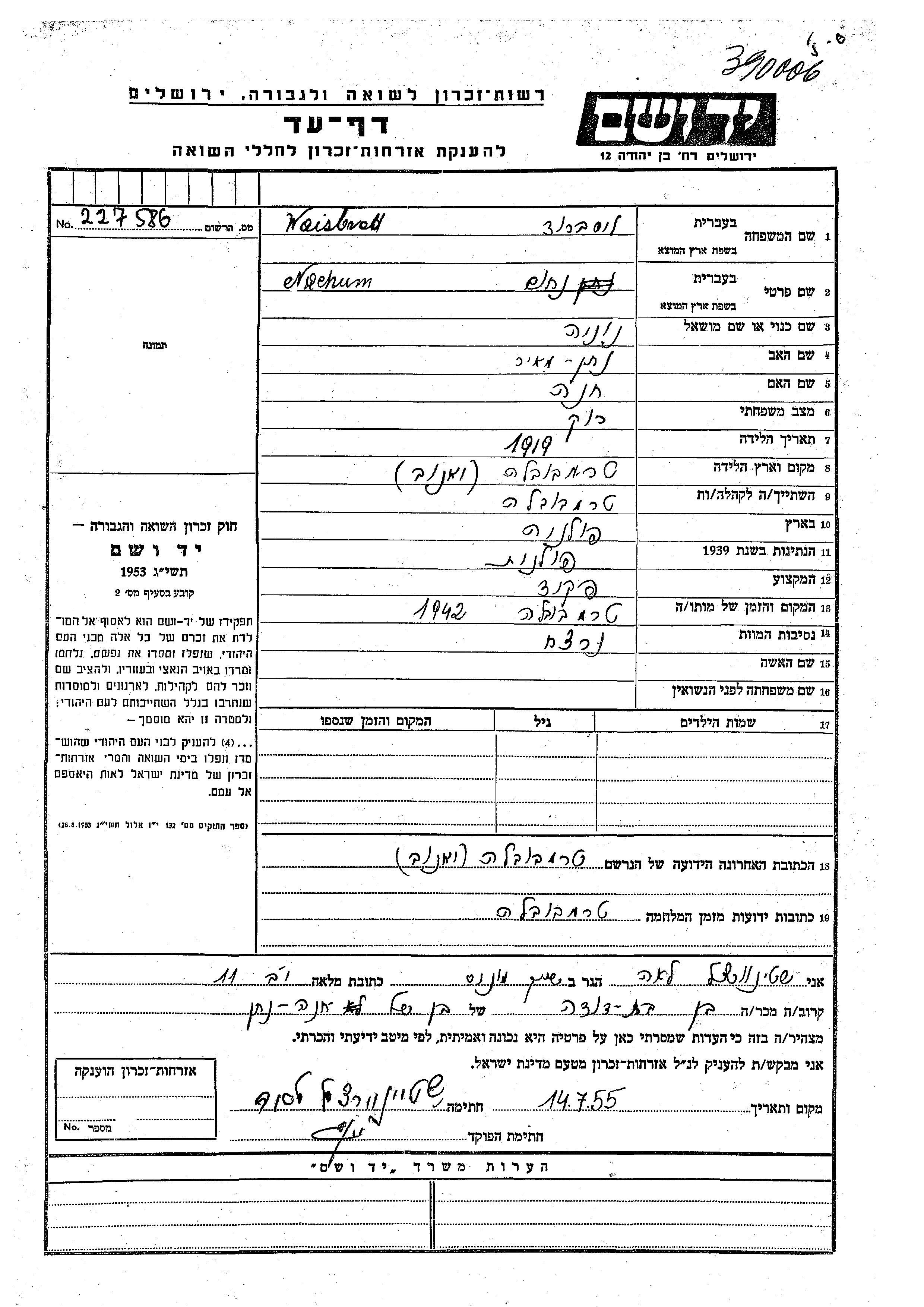 Вайсброд Нахум 1919 Трембовль, Польша Лист свидетельских показаний