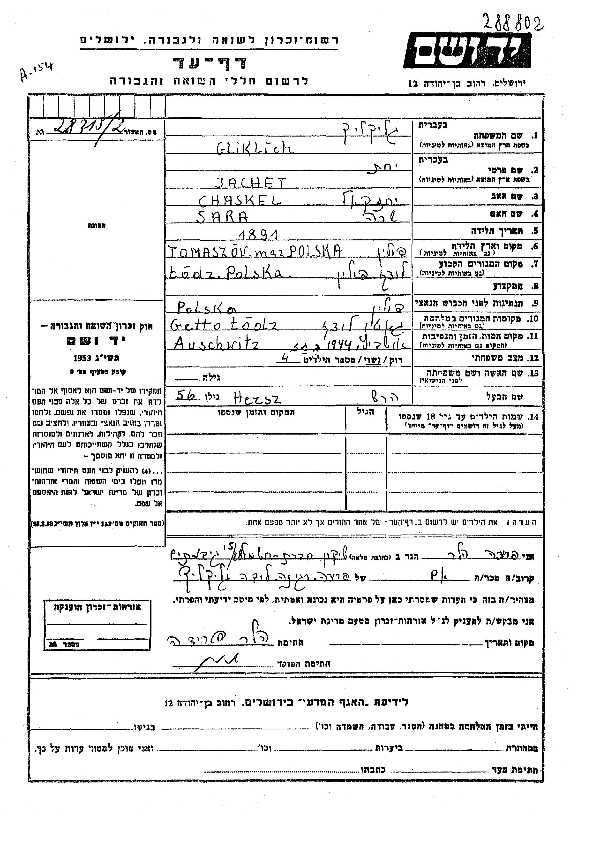 Яхет Гликлих, место рождения: Томашув-Мазовецки, Польша. Отец: Хаскель, mать:Сара. Женат / замужем. Место жительства до войны: Лодзь, Польша. Место во время войны: Лодзь, Польша.