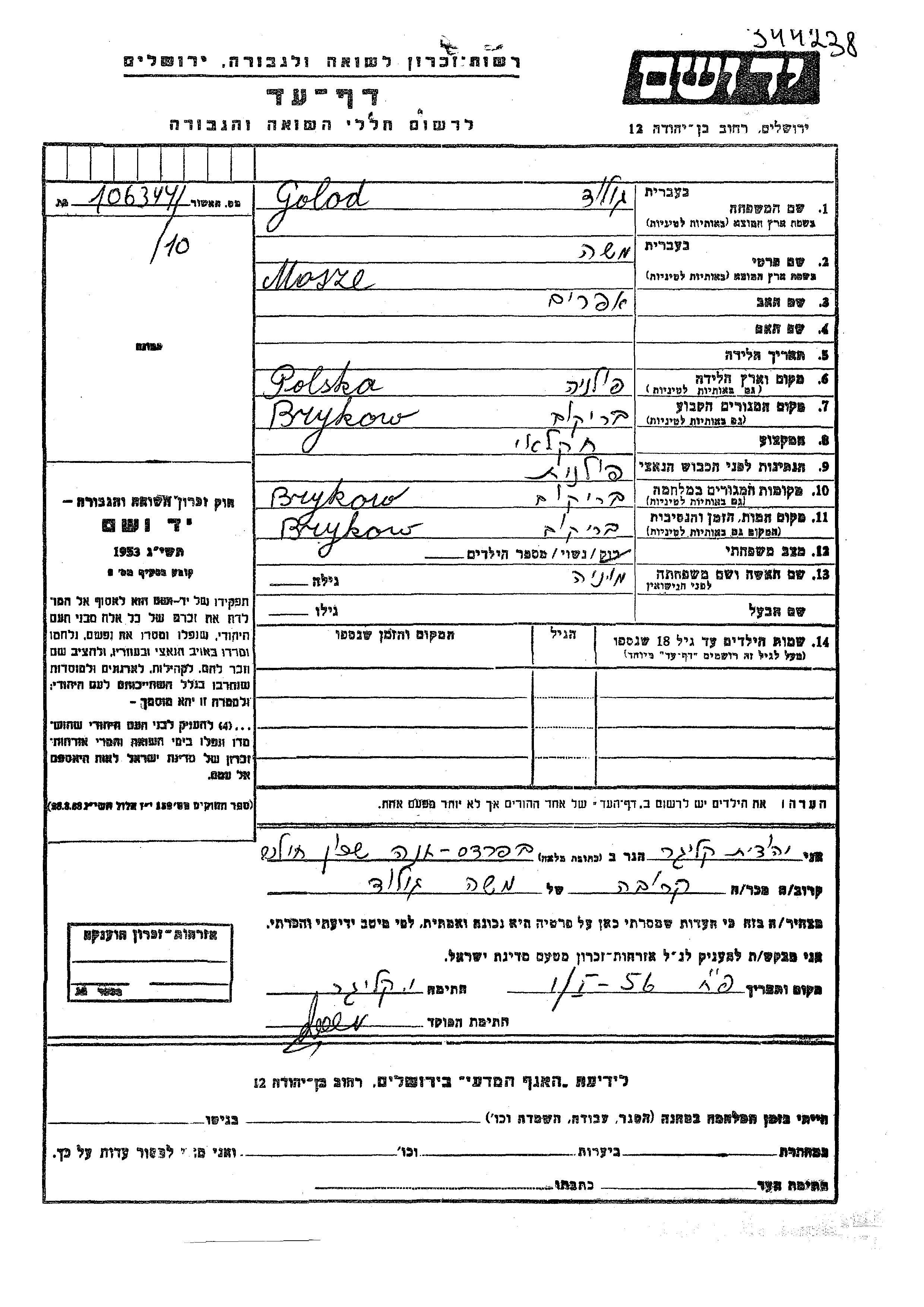 Моше Голод, место рождения: Польша. Отец: Эфраим. Земледелец / земледелица. Женат / замужем. Место жительства до войны: Бриков, Польша. Место во время войны: Бриков, Польша.