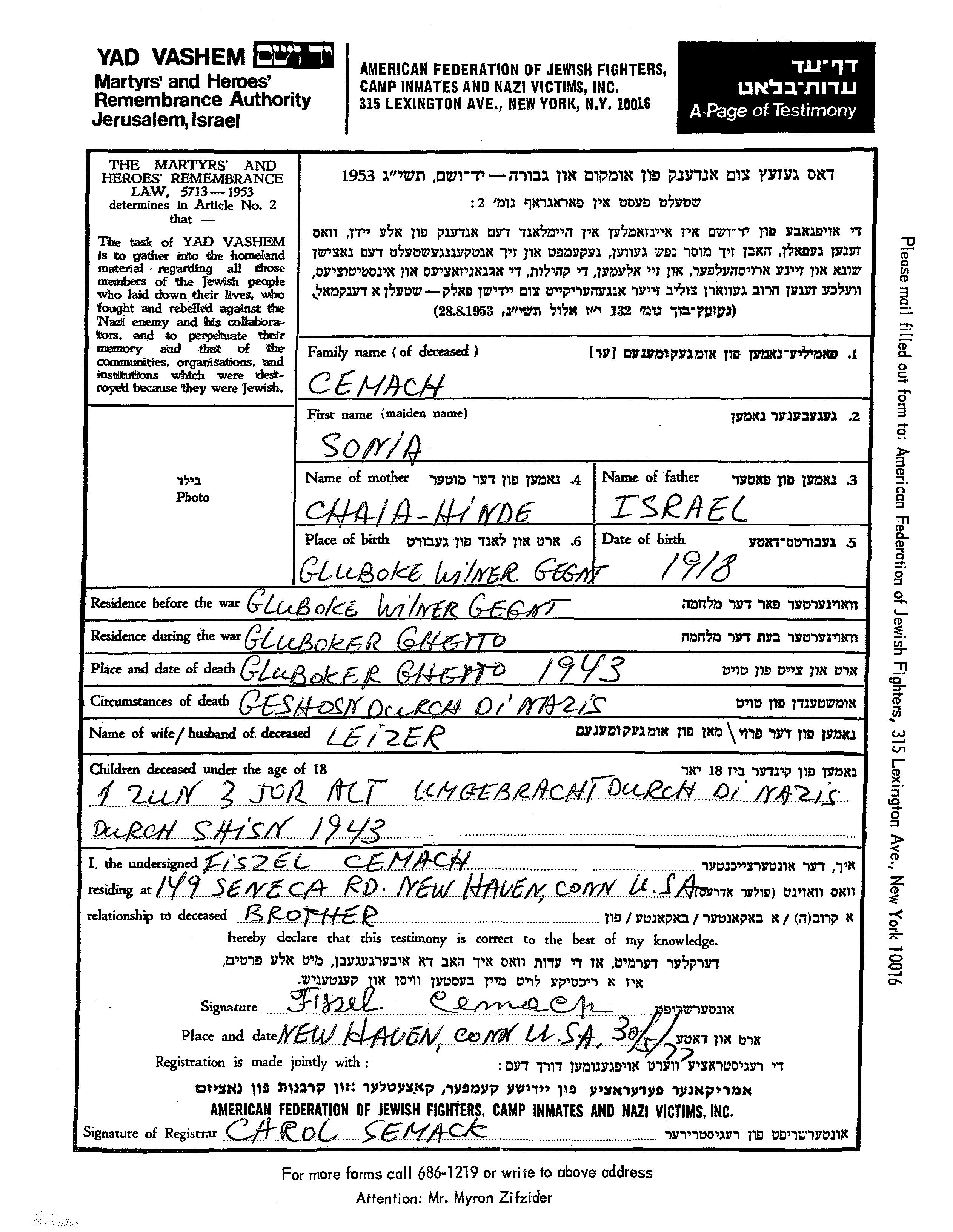 Соня Цемах, место рождения: Глембокие, Польша. Отец: Исраэль, mать:Хая Хинде. Женат / замужем. Место жительства до войны: Глембокие, Польша. Место во время войны: Глембокие, Польша.