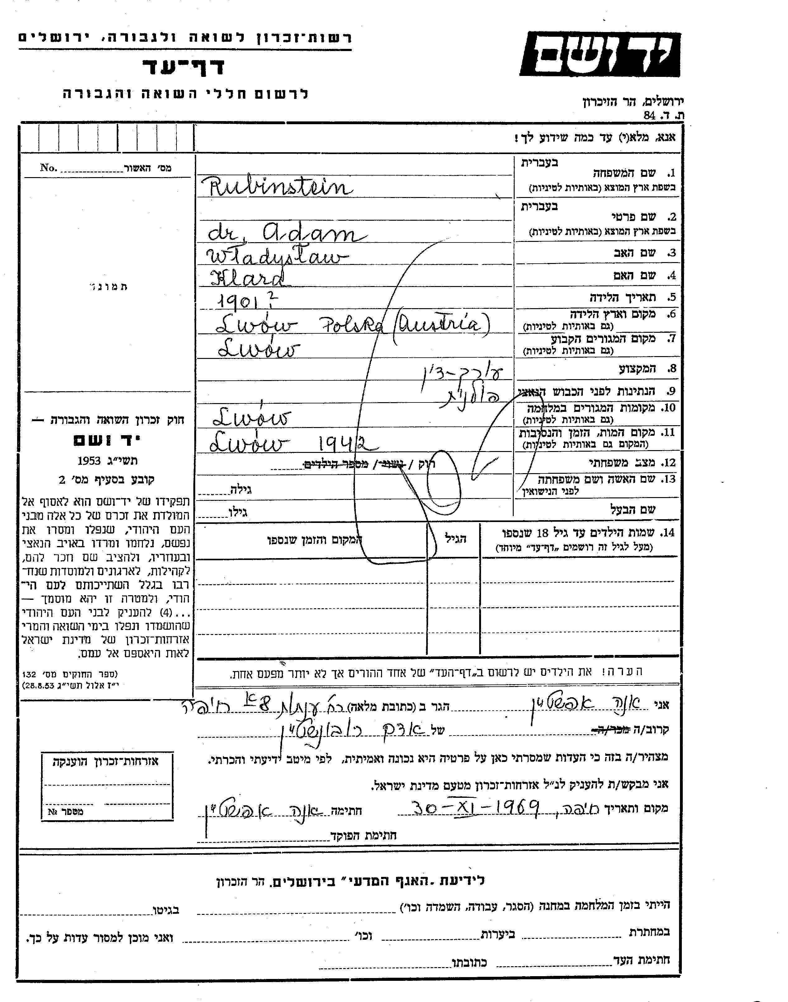Др. Адам Рубинштайн, место рождения: Львов, Польша. Отец: Владислав, mать:Клара. Адвокат. Холост / не замужем. Место жительства до войны: Львов, Польша. Место во время войны: Львов, Польша.
