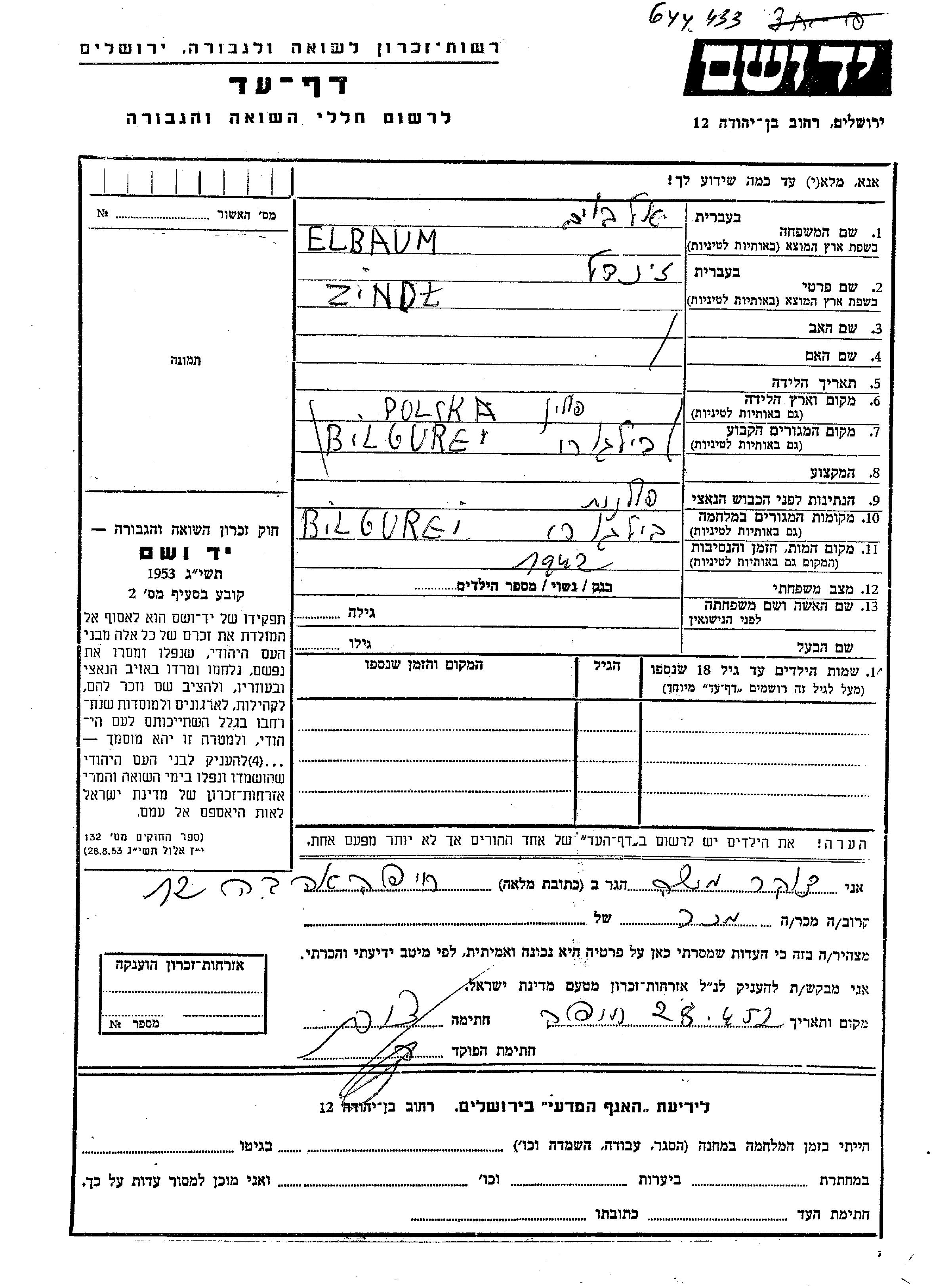 Эльбаум Зиндл Билгорай, Польша Лист свидетельских показаний