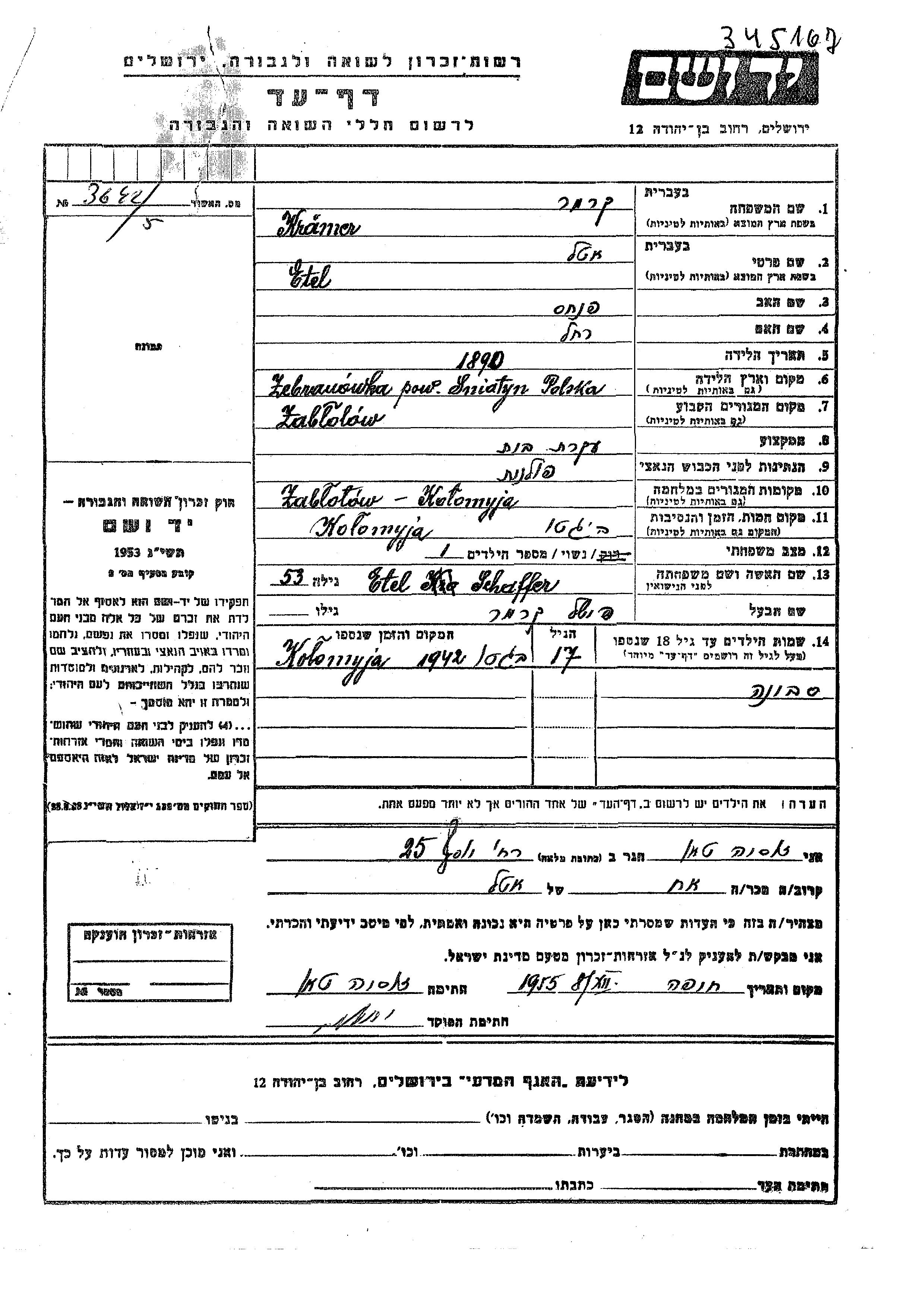 Этель Крамер, девичья фамилия Шаффер, место рождения: Зибрановка, Польша. Отец: Пинхас, mать:Рахель. Домохозяйка. Женат / замужем. Место жительства до войны: Заболотов, Польша. Место во время войны: Заболотов, Польша.