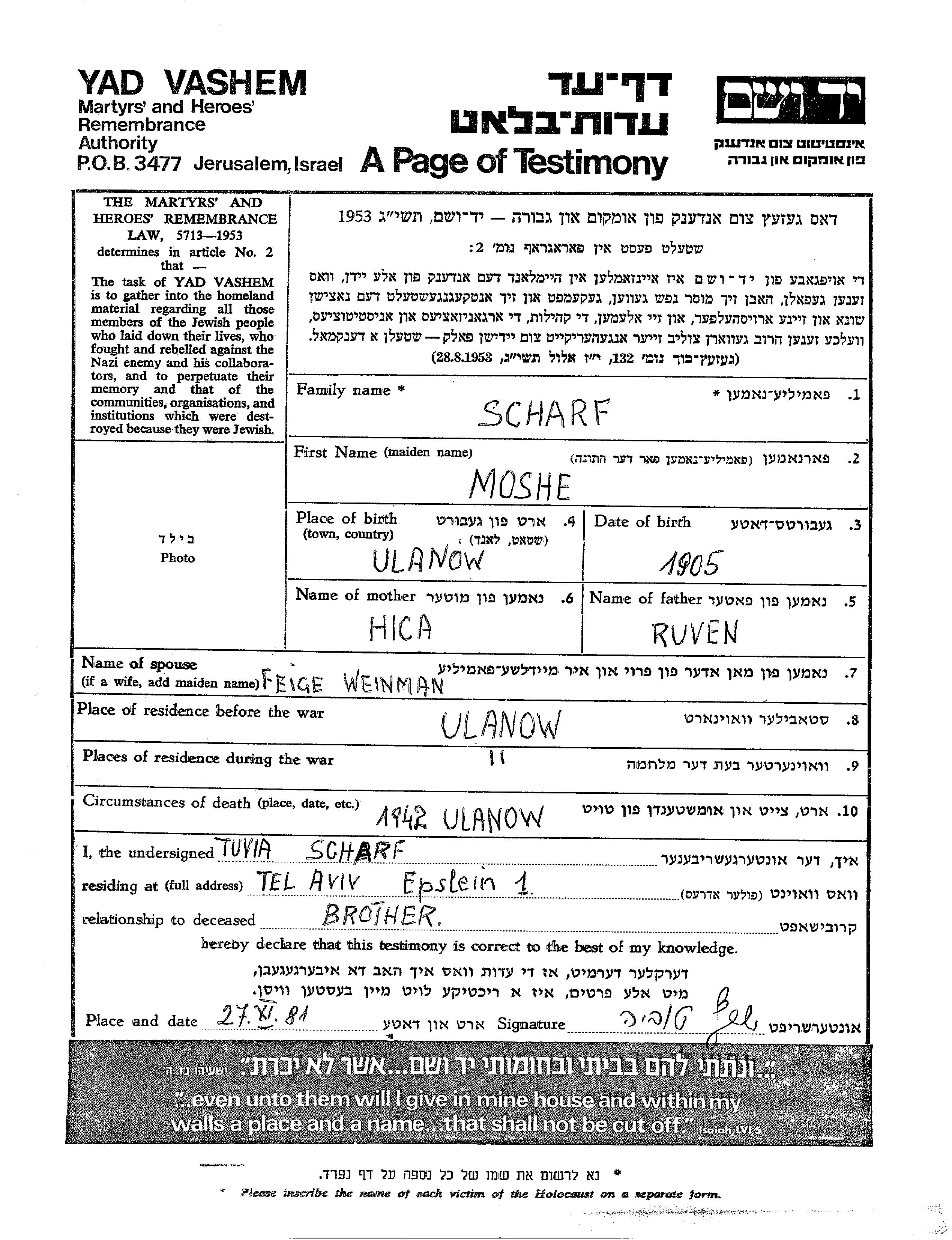 Моше Шарф, место рождения: Улянув, Польша. Отец: Рувен, mать:Хица. Женат / замужем. Место жительства до войны: Улянув, Польша. Место во время войны: Улянув, Польша.