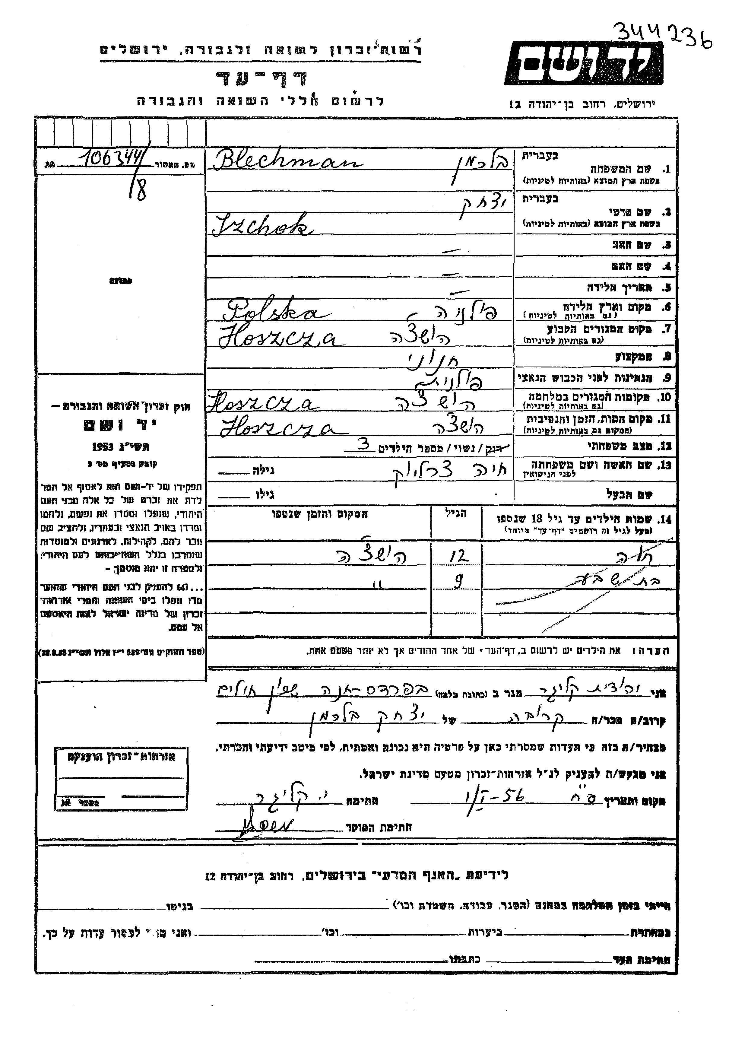 Ицхак Блехман, место рождения: Польша. Бакалейщик / бакалейщица. Женат / замужем. Место жительства до войны: Гоща, Польша. Место во время войны: Гоща, Польша.