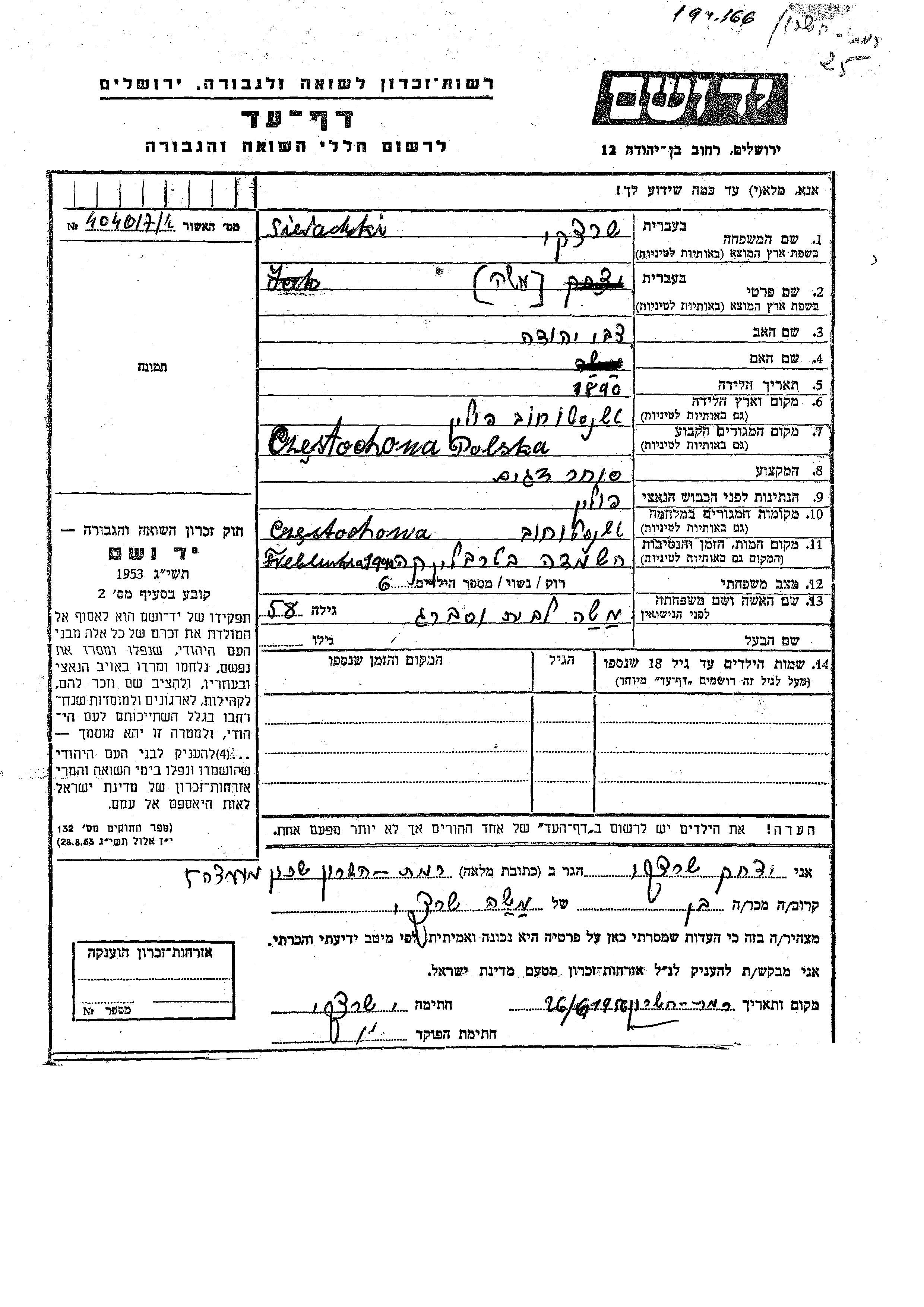 Шерацки Моше 1890 Ченстохова, Польша Лист свидетельских показаний