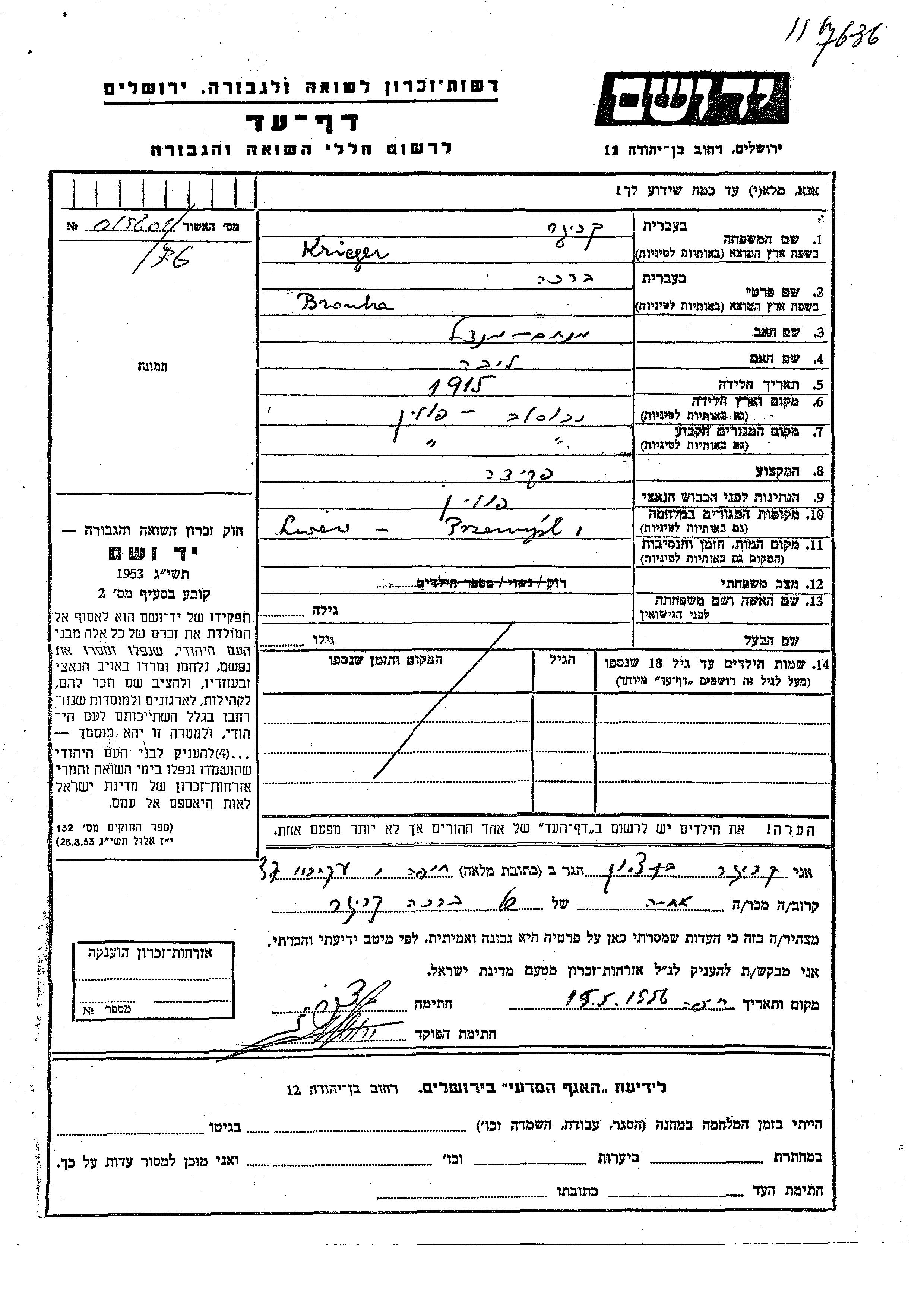 Бруха Кригер, место рождения: Ярослав, Польша. Отец: Менахем Мендель, mать:Либа. Клерк. Холост / не замужем. Место жительства до войны: Ярослав, Польша. Место во время войны: Пшемысль, Польша.