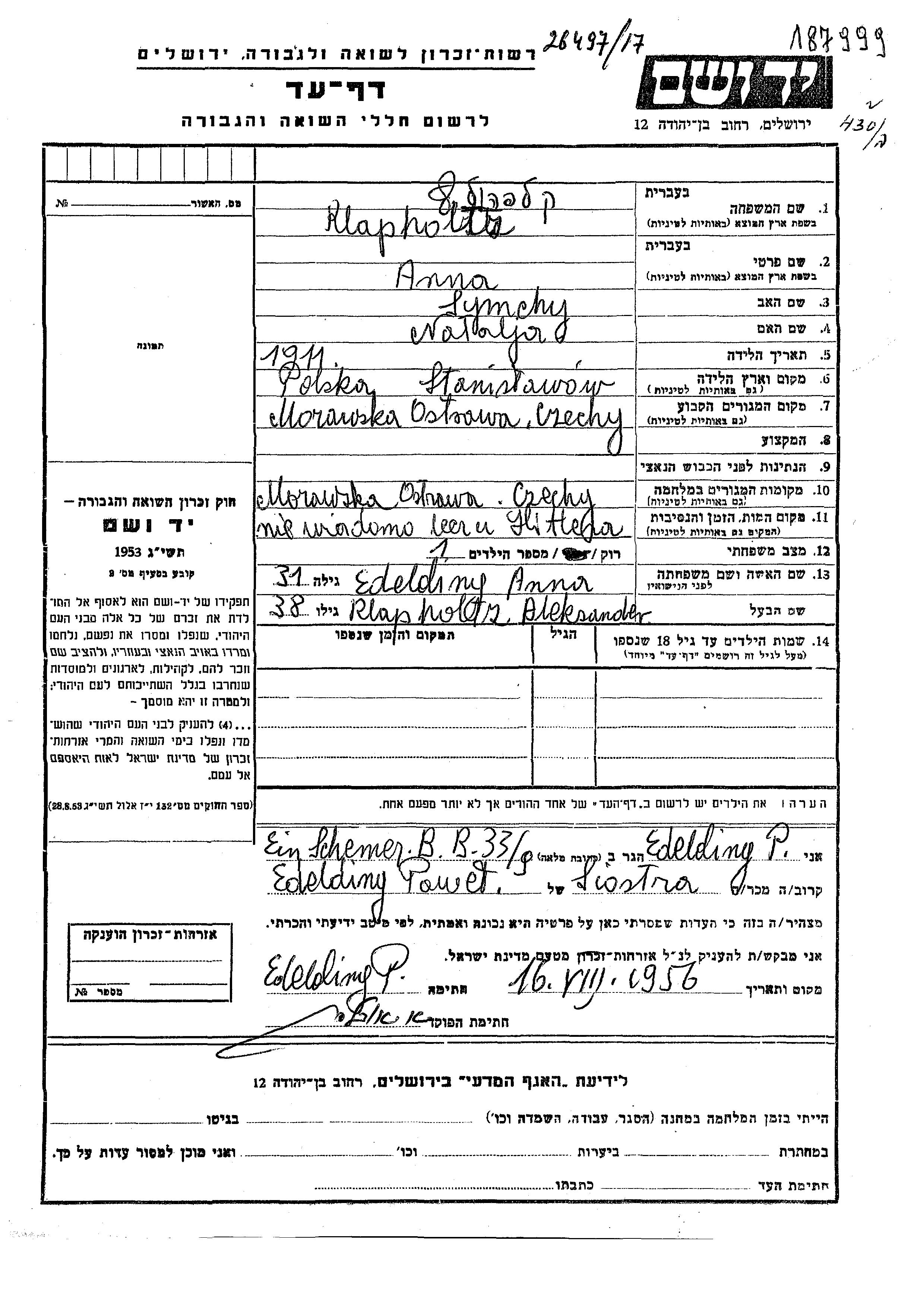 Анна Клапхольц, девичья фамилия Эдельдинг, место рождения: Станиславув, Польша. Отец: Симхи, mать:Наталья. Холост / не замужем. Место жительства до войны: Моравска Острава, Чехословакия. Место во время войны: Моравска Острава, Чехословакия.