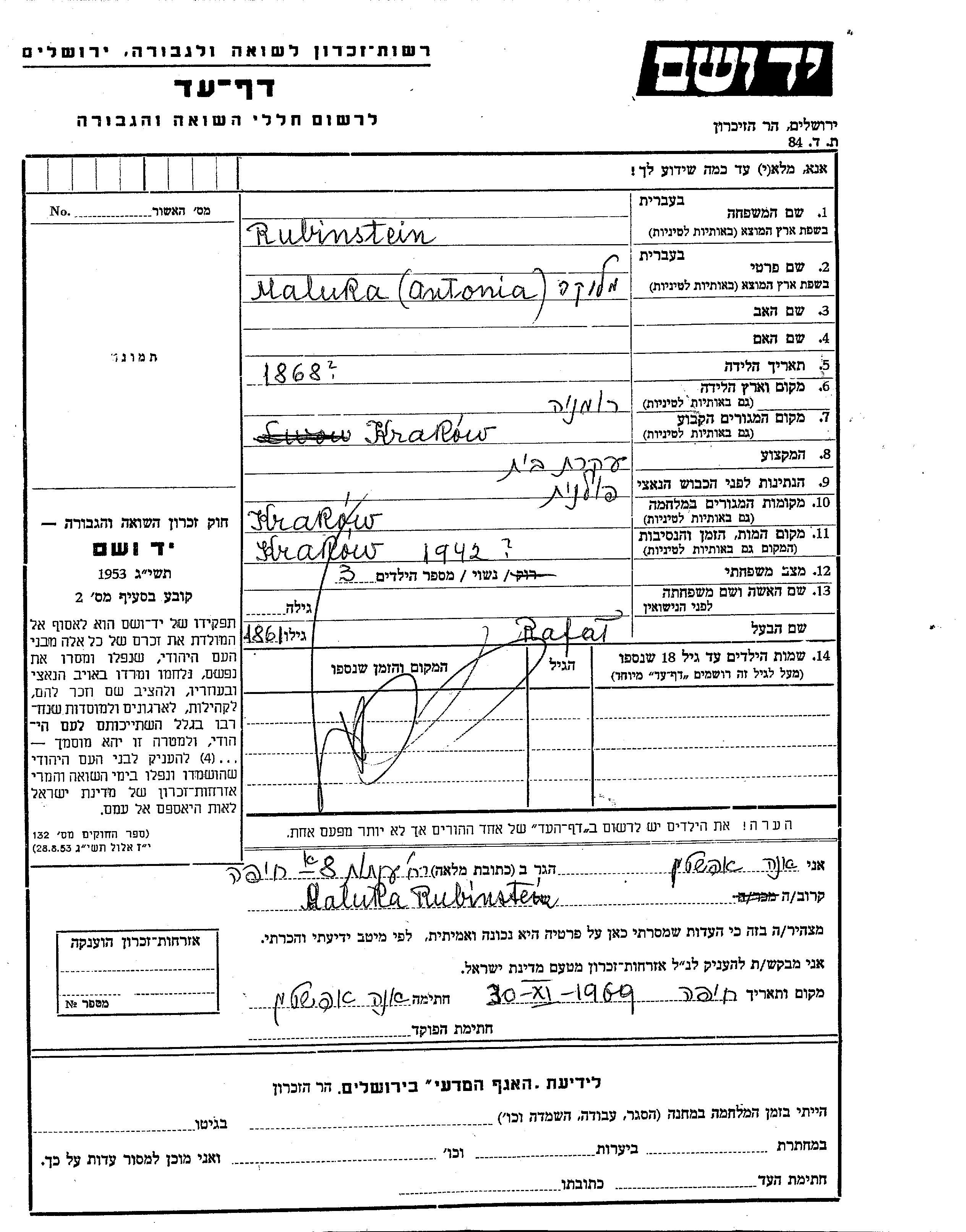 Малука Антония Рубинштайн, место рождения: Румыния. Домохозяйка. Женат / замужем. Место жительства до войны: Краков, Польша. Место во время войны: Краков, Польша.