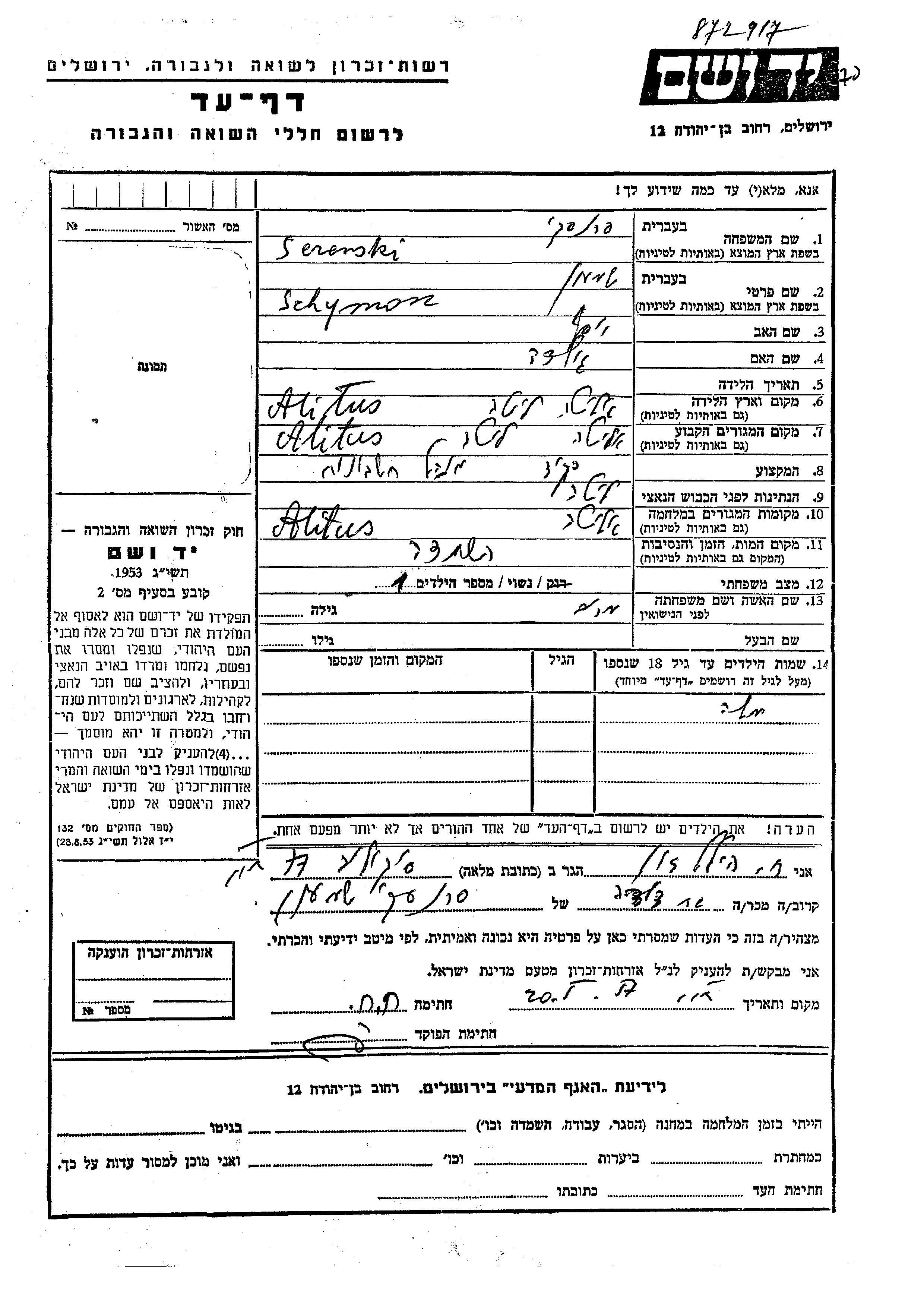 Шимон Серенски, место рождения: Алитус, Литва. Отец: Иосеф, mать:Голда. Клерк. Женат / замужем. Место жительства до войны: Алитус, Литва. Место во время войны: Алитус, Литва.