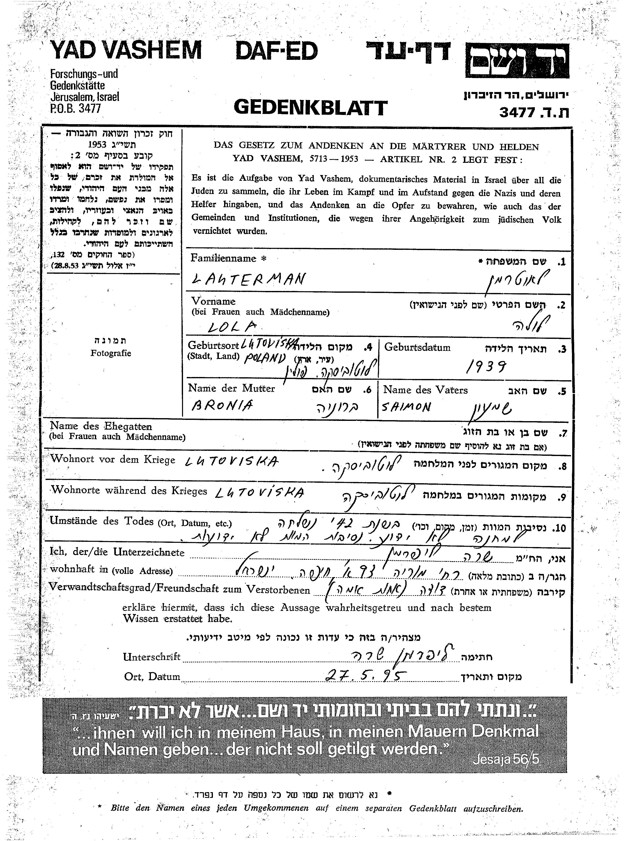 Лола Лаутерман, место рождения: Лютовиска, Польша. Отец: Саймон, mать:Броня. Место жительства до войны: Лютовиска, Польша. Место во время войны: Лютовиска, Польша.