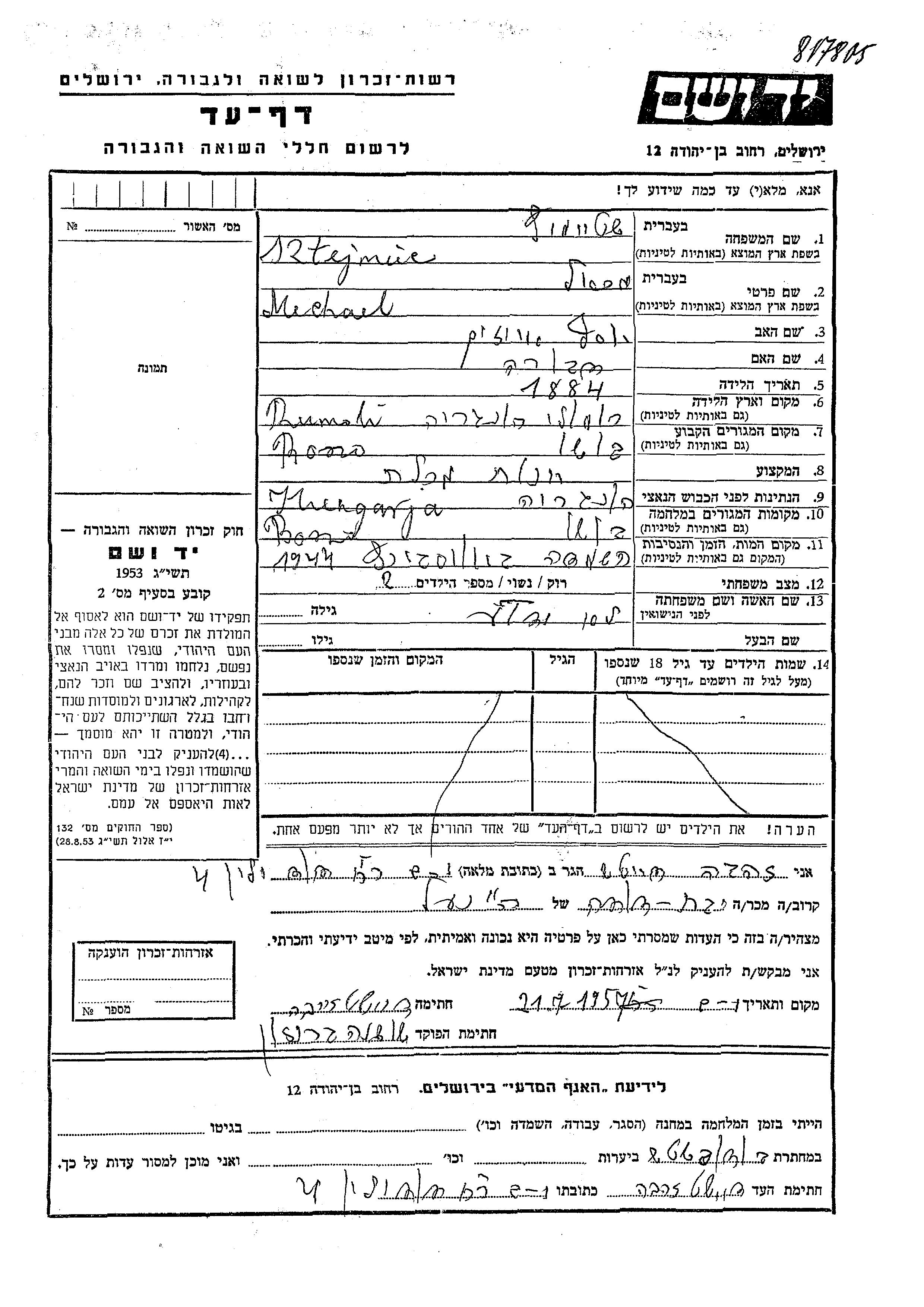 Михаэль Штеймиц, место рождения: Ромули, Румыния. Отец: Иосеф Айзик, mать:Двора. Женат / замужем. Место жительства до войны: Бачо, Чехословакия. Место во время войны: Бачо, Чехословакия.