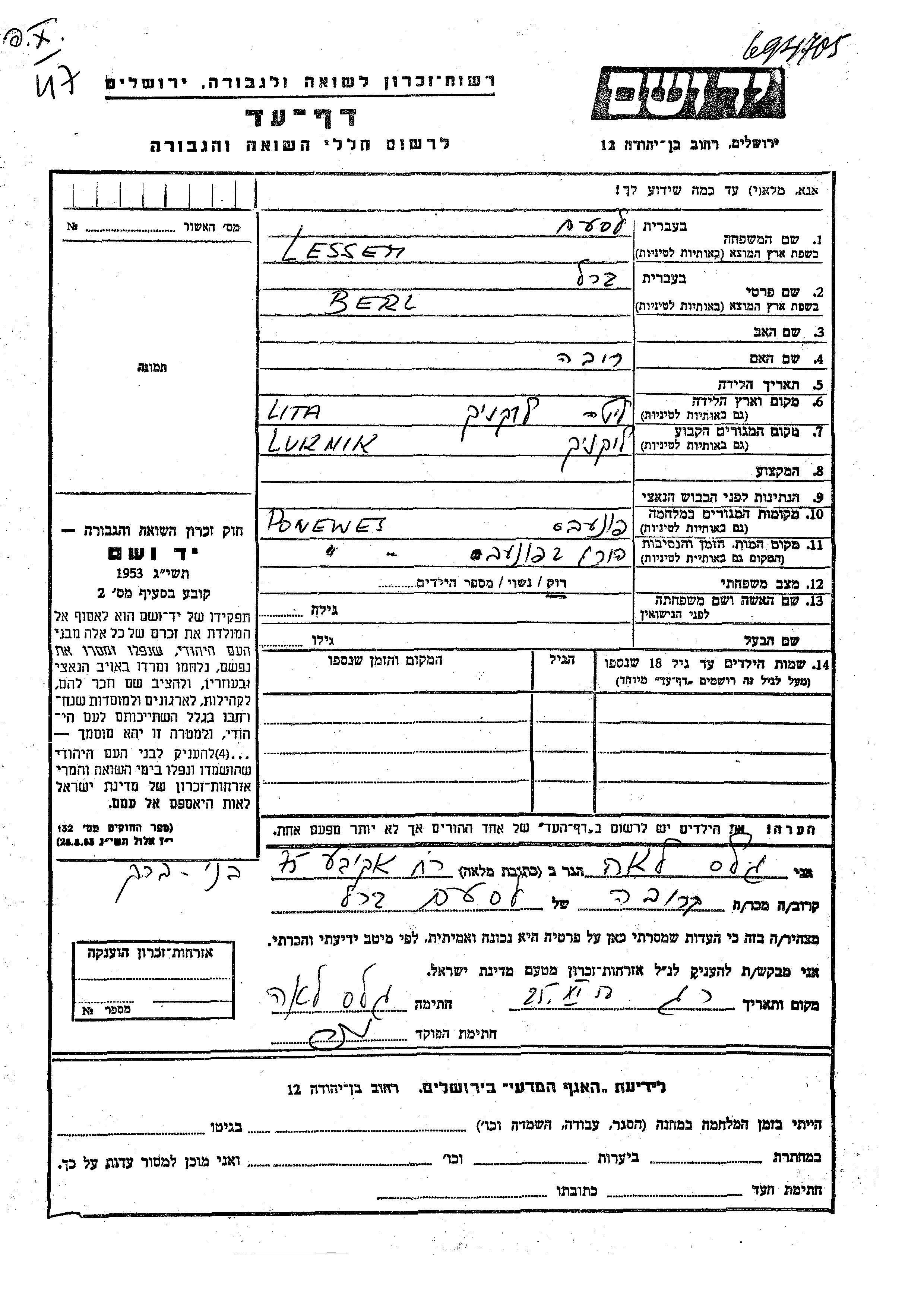 Берл Лессем, место рождения: Луоке, Литва.Mать:Рива. Холост / не замужем. Место жительства до войны: Луоке, Литва. Место во время войны: Поневеш, Литва.