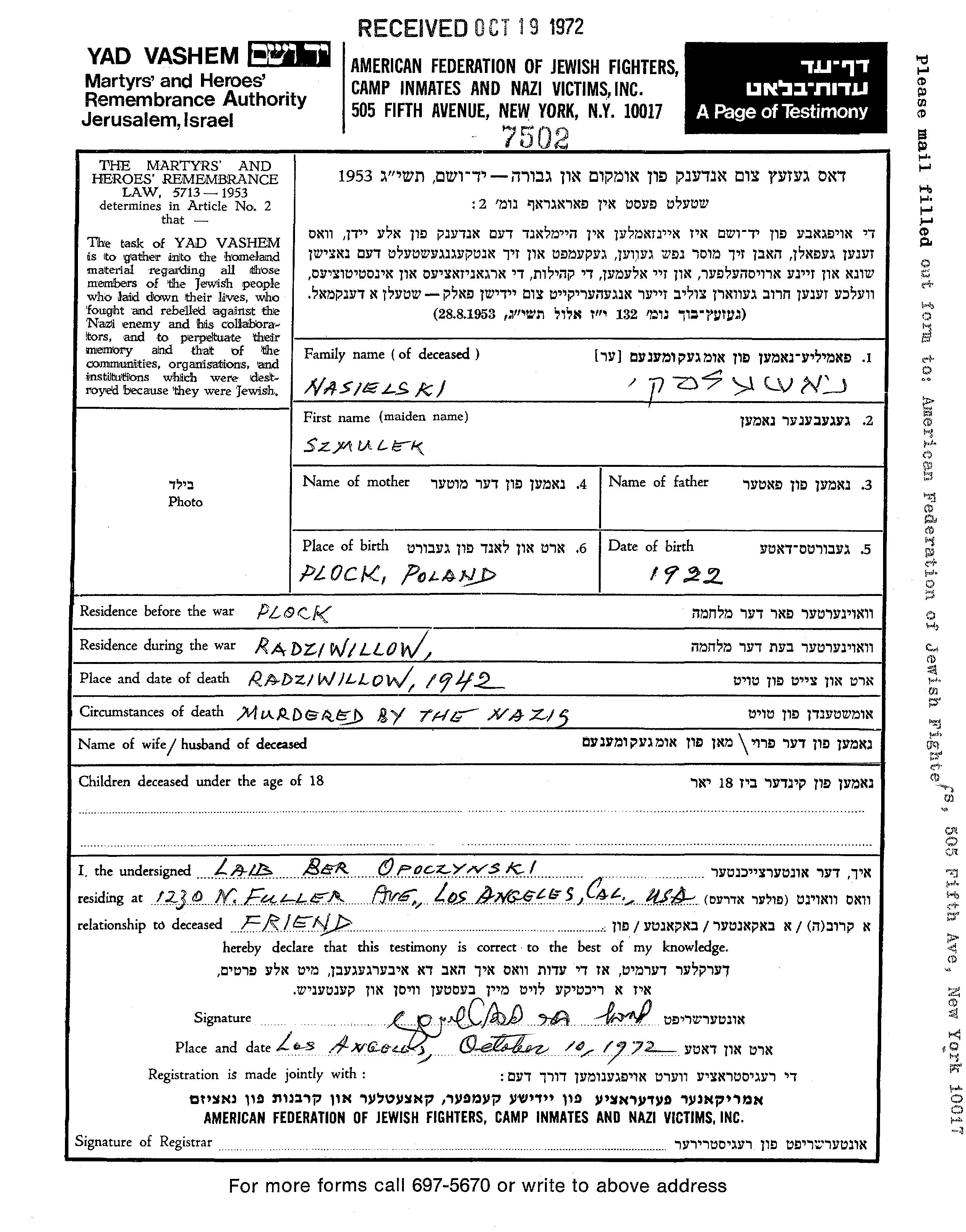Шмулек Насельски, место рождения: Плоцк, Польша. Место жительства до войны: Плоцк, Польша. Место во время войны: Радивилов, Польша.