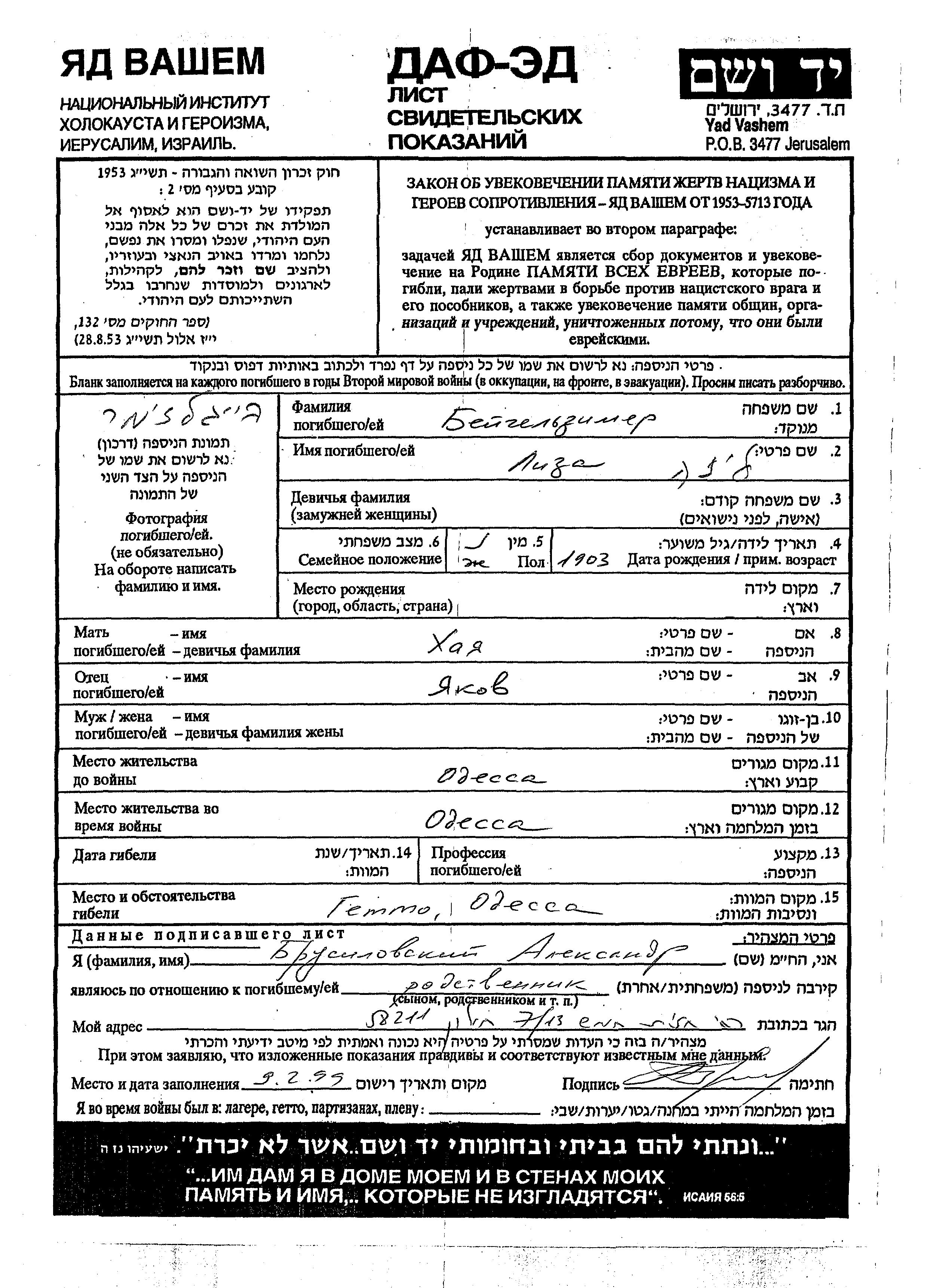 Бейгельзимер Лиза 1903 Одесса, Украина (СССР) Лист свидетельских показаний