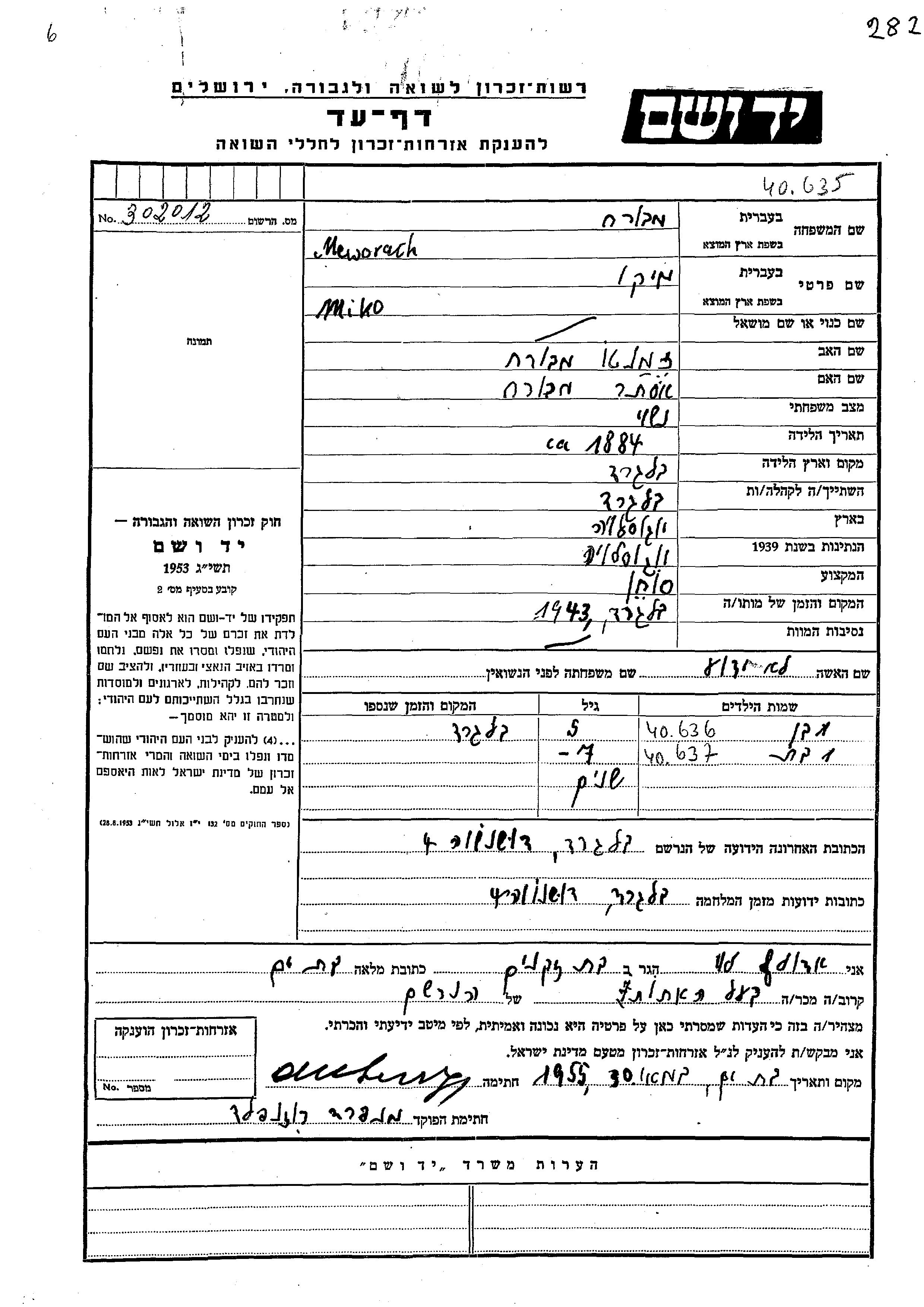 Мико Меворах, место рождения: Белград, Югославия. Отец: Земанто, mать:Эстер. Агент. Женат / замужем. Место жительства до войны: Белград, Югославия. Место во время войны: Белград, Югославия.