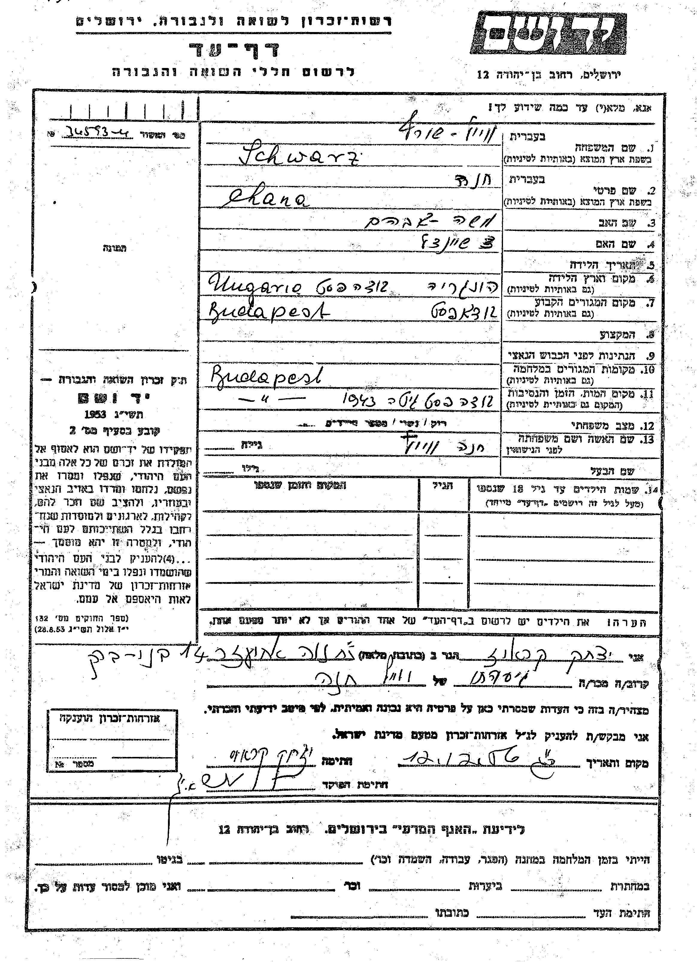 Хана Шварц, девичья фамилия Войч, место рождения: Будапешт, Венгрия. Отец: Моше Авраам, mать:Шейндель. Женат / замужем. Место жительства до войны: Будапешт, Венгрия. Место во время войны: Будапешт, Венгрия.