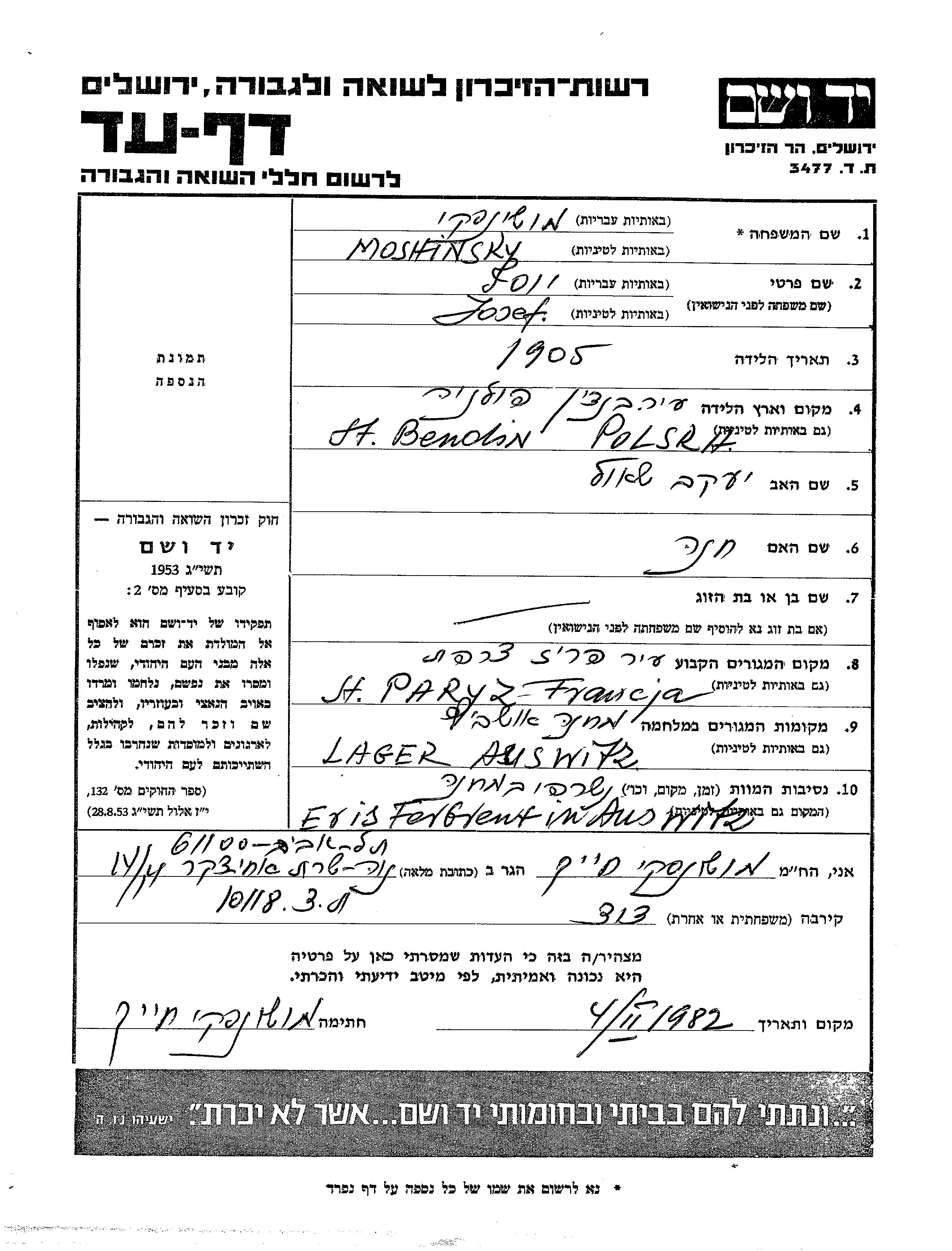 Йосеф Мошински, место рождения: Бендин, Польша. Отец: Яков Шауль, mать:Хана. Место жительства до войны: Париж, Франция. Место во время войны: Аушвиц, Польша.