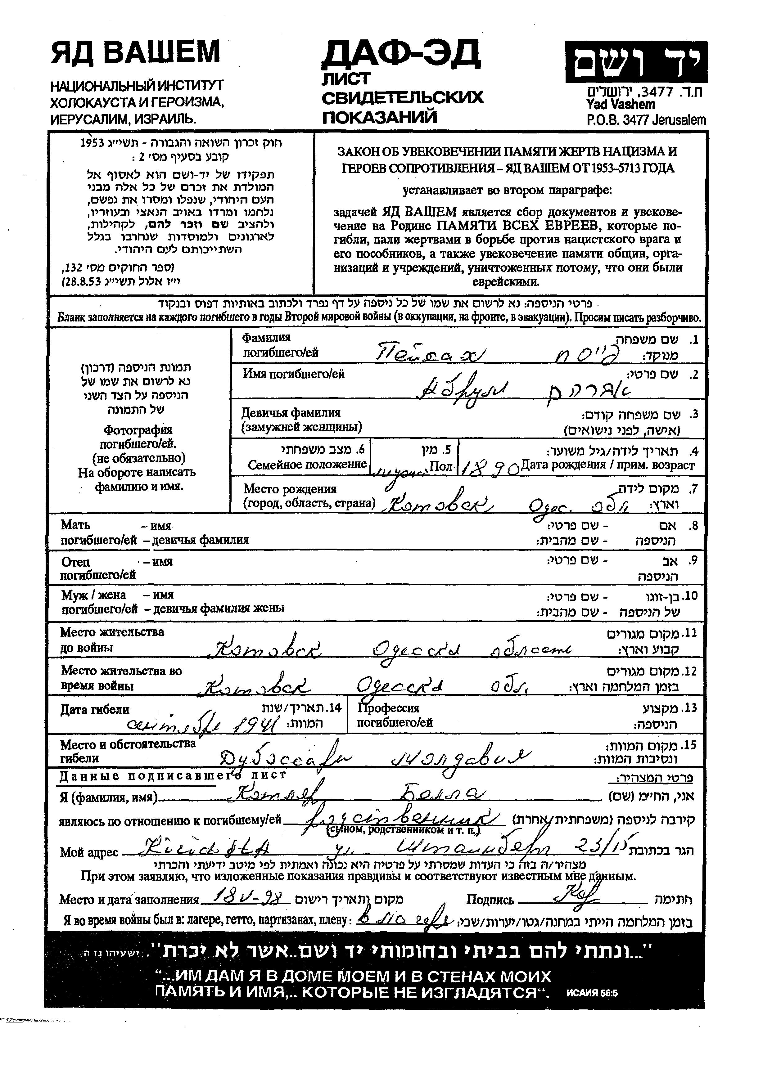 Яд Вашем - Листы свидетельских показаний Мемориального фонда