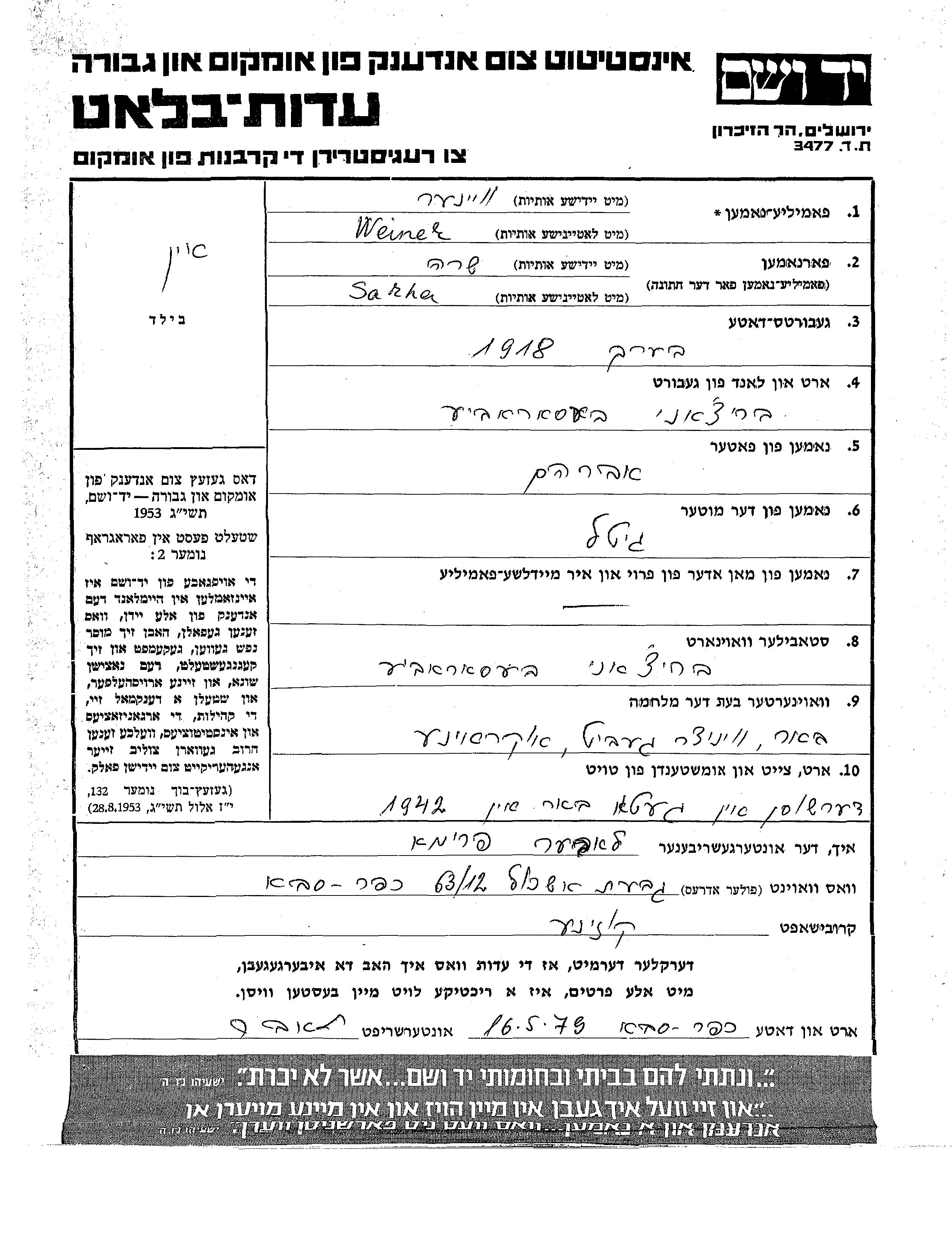 Вейнер Винер Сара 1918 Бричень, Румыния Лист свидетельских показаний