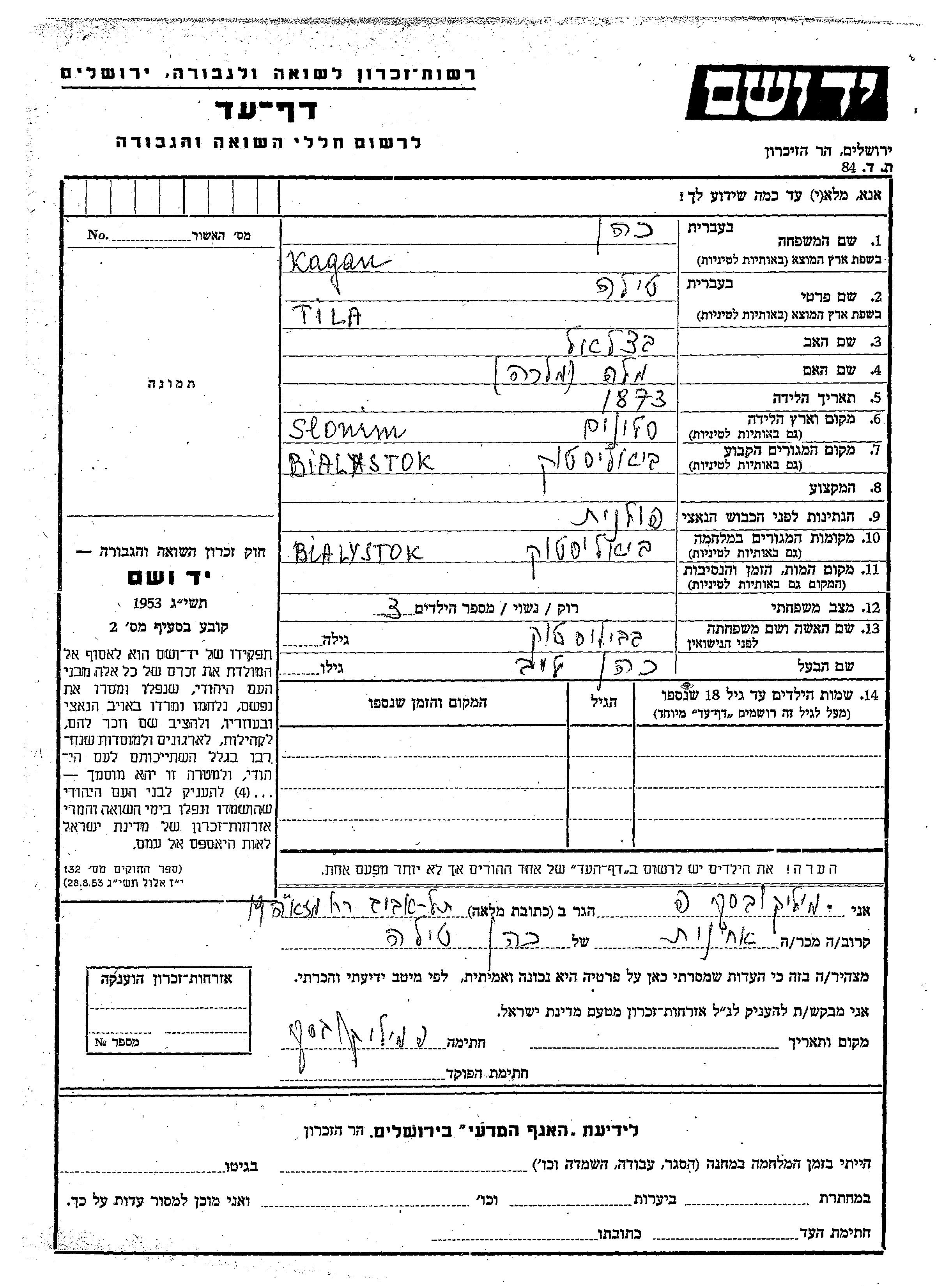 Тиля Каган Коэн, место рождения: Слоним, Польша. Отец: Бецалель, mать:Мала. Женат / замужем. Место жительства до войны: Белосток, Польша. Место во время войны: Белосток, Польша.