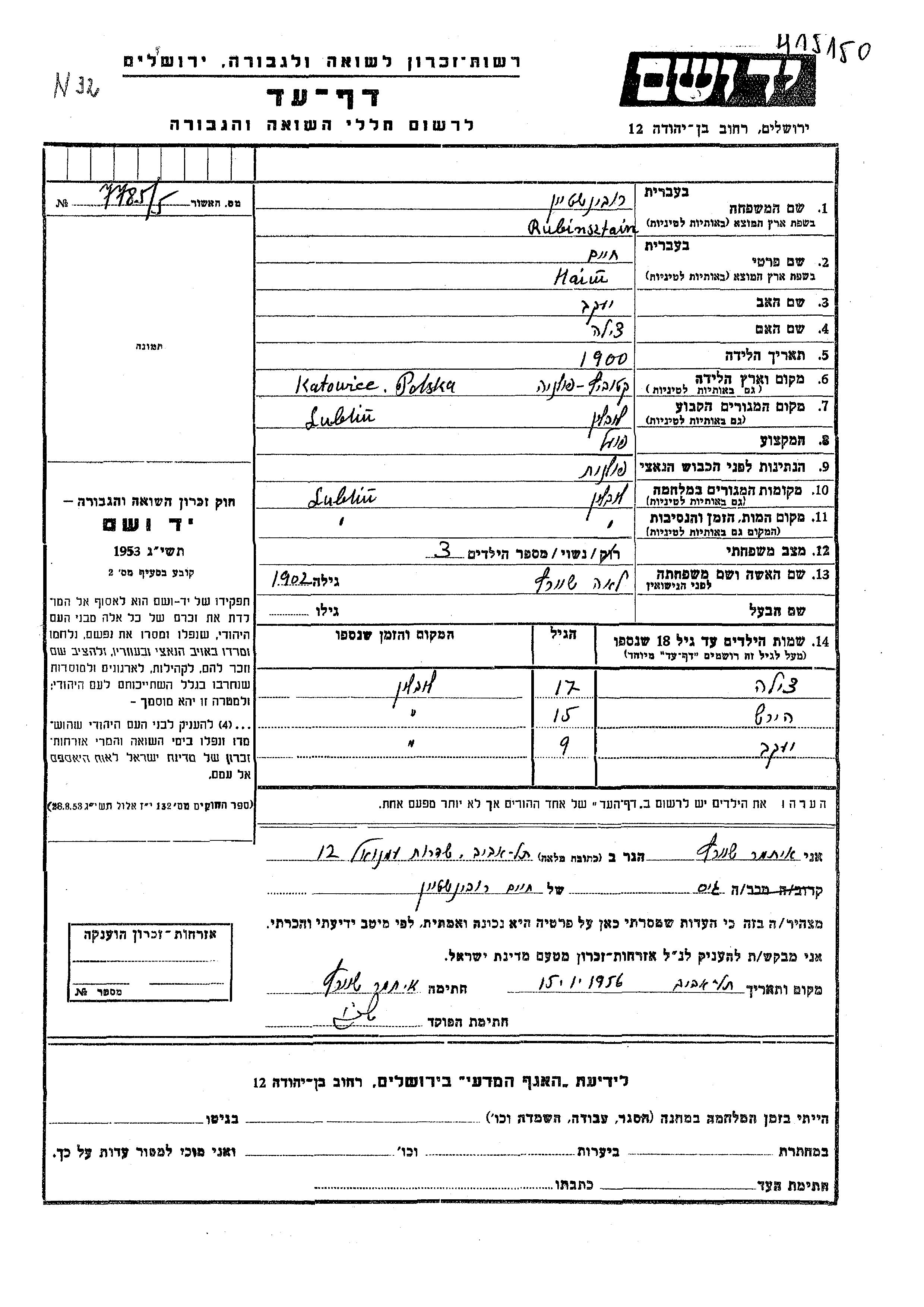 Хаим Рубинштайн, место рождения: Катовице, Польша. Отец: Яков, mать:Цила. Рабочий / рабочая. Женат / замужем. Место жительства до войны: Люблин, Польша. Место во время войны: Люблин, Польша.