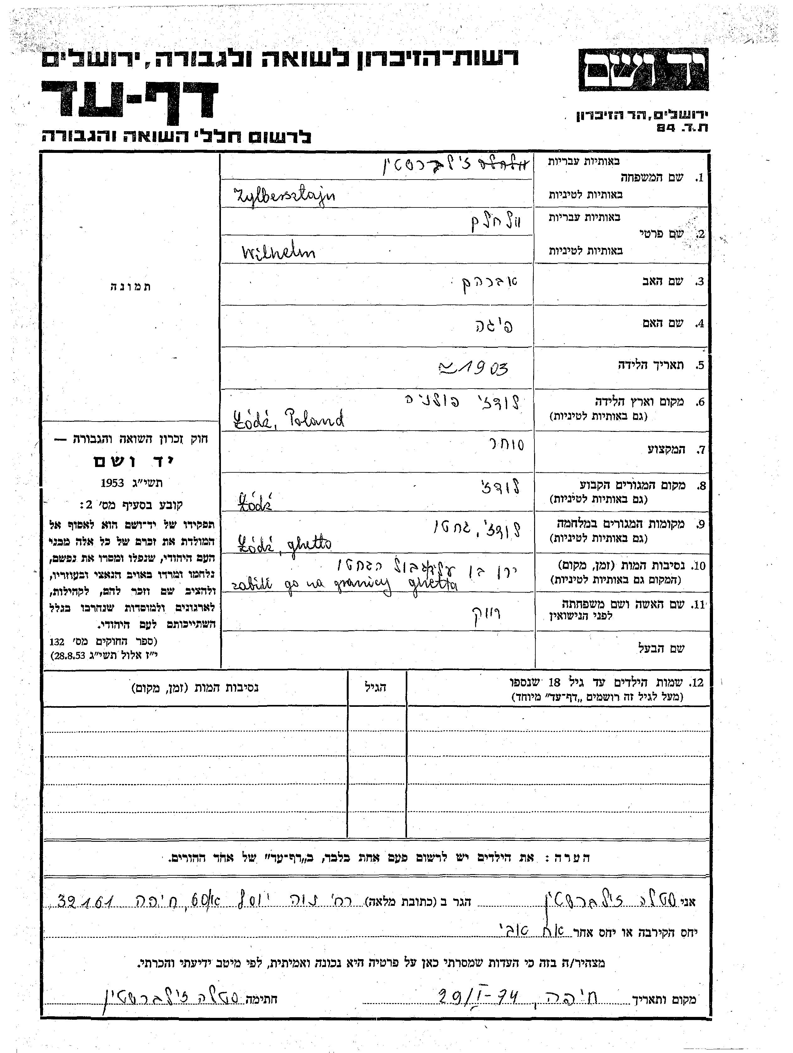 Зильберштайн Вильхельм 1903 Лодзь, Польша Лист свидетельских показаний