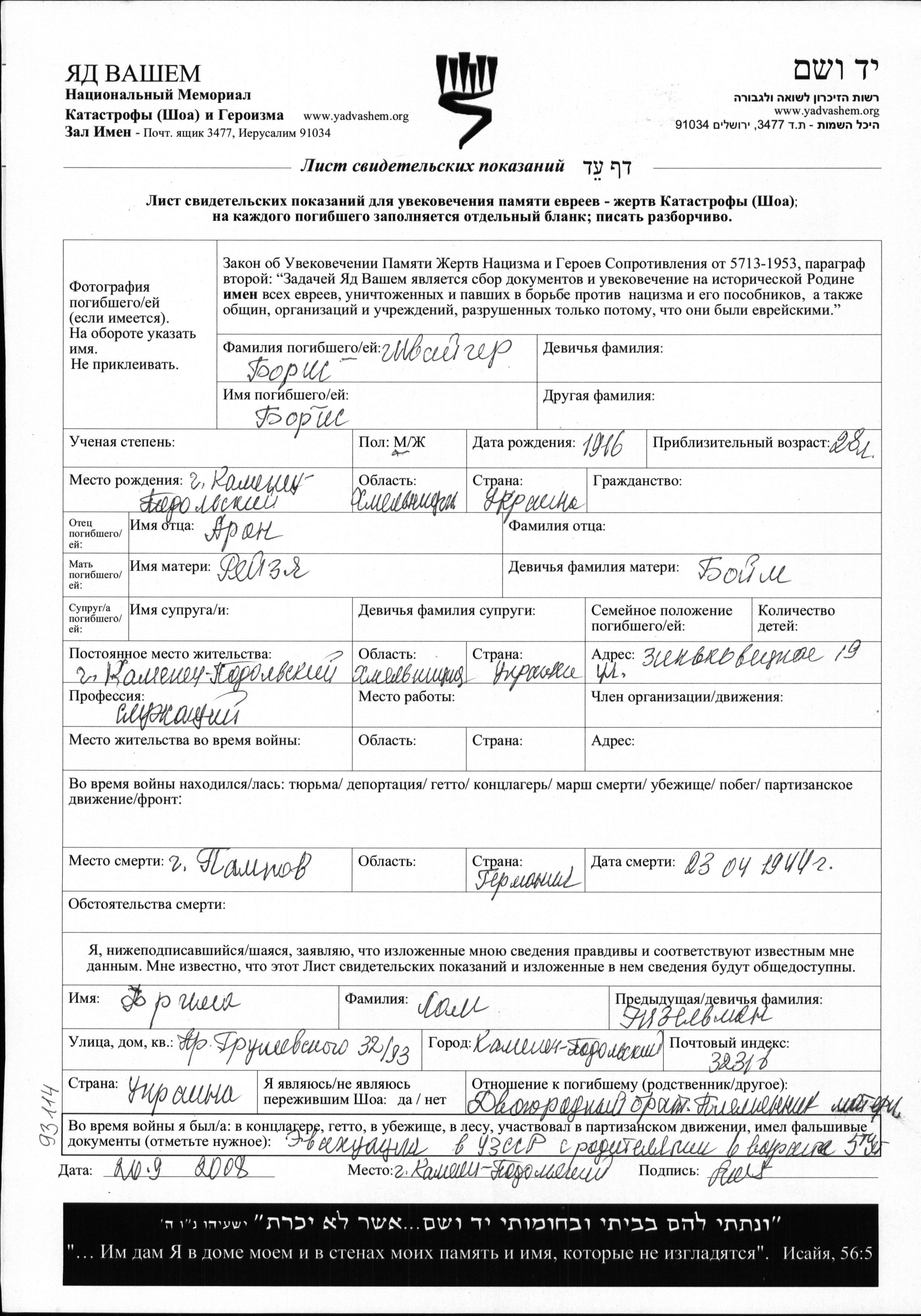 Борис Швайгер, место рождения: Каменец-Подольский, Украина (СССР). Отец: Арон, mать:Рейзя, девичья фамилия Бойм. Служащий / служащая. Место жительства до войны: Каменец-Подольский, Украина (СССР). Место во время войны: Вооруженные силы Советского Союза. Борис погиб на военной службе. место смерти: <> (<>), Германия в 23/04/1944.