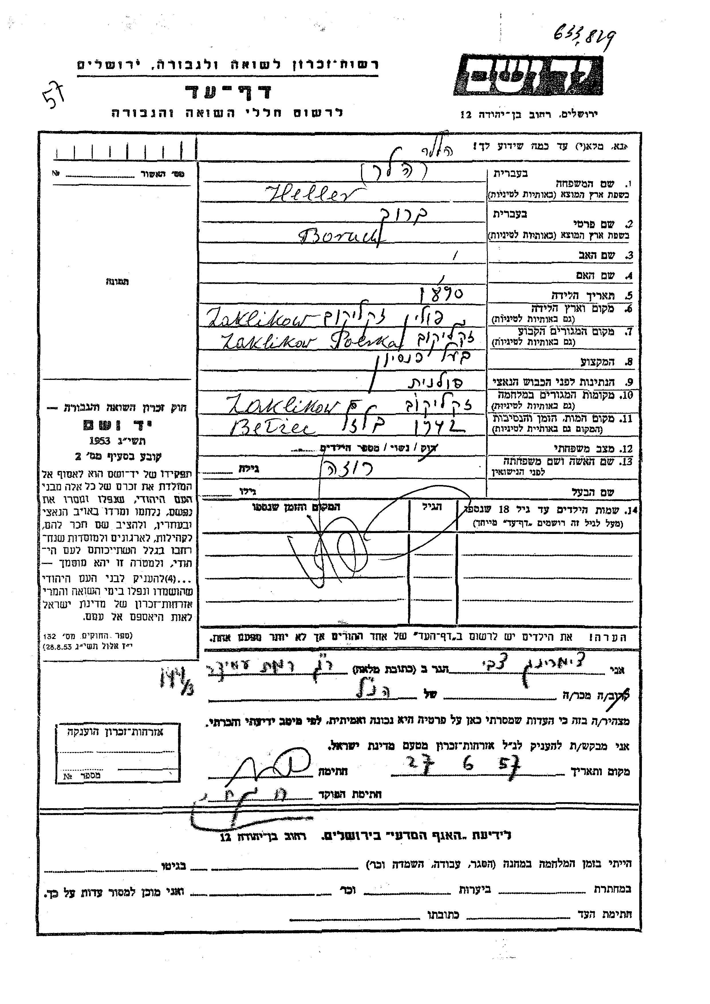 Хеллер Барух 1890 Закликув, Польша Лист свидетельских показаний