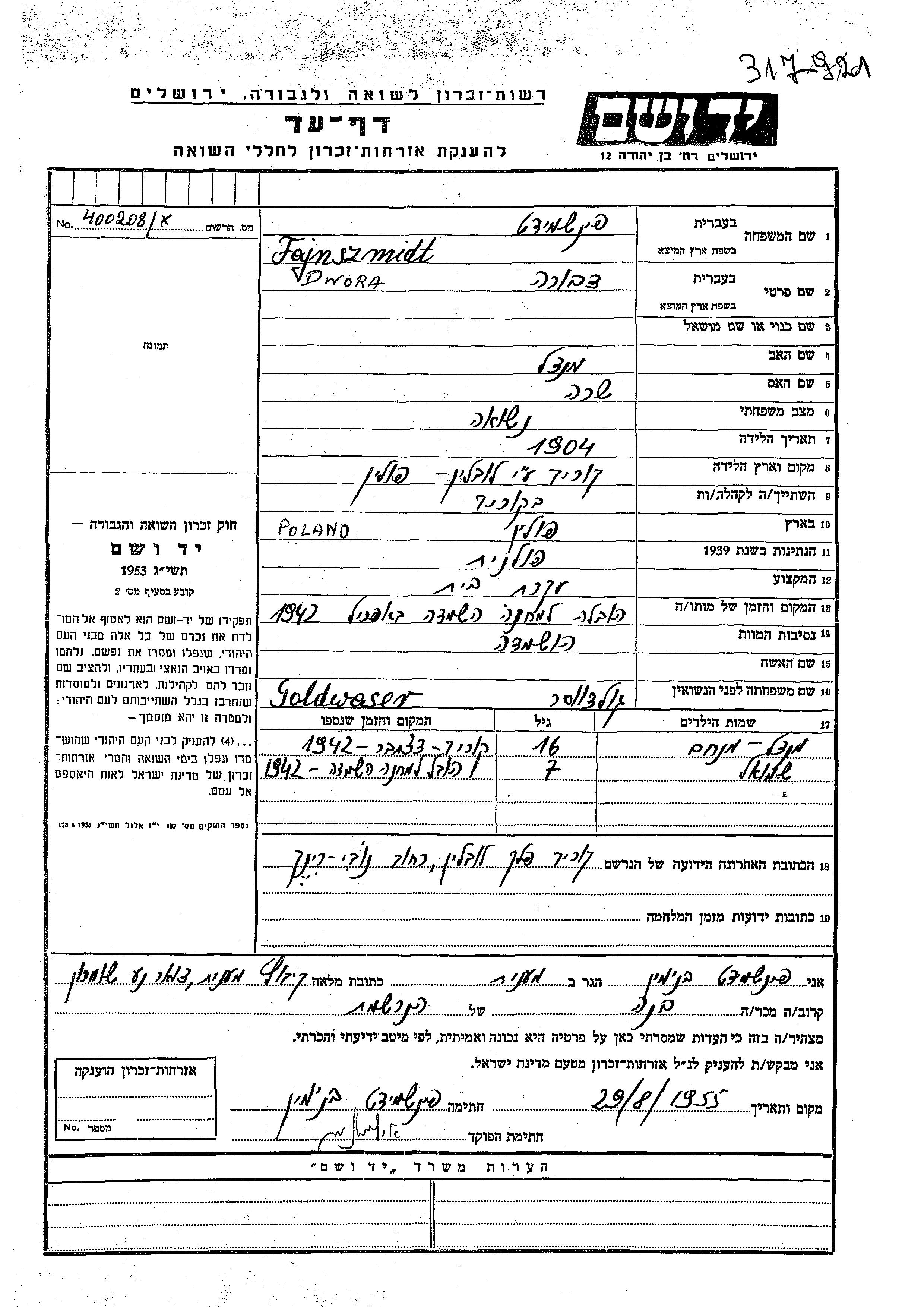 Двора Файншмидт, девичья фамилия Гольдвасер, место рождения: Курув, Польша. Отец: Мендель, mать:Сара. Домохозяйка. Женат / замужем. Место во время войны: Курув, Польша.