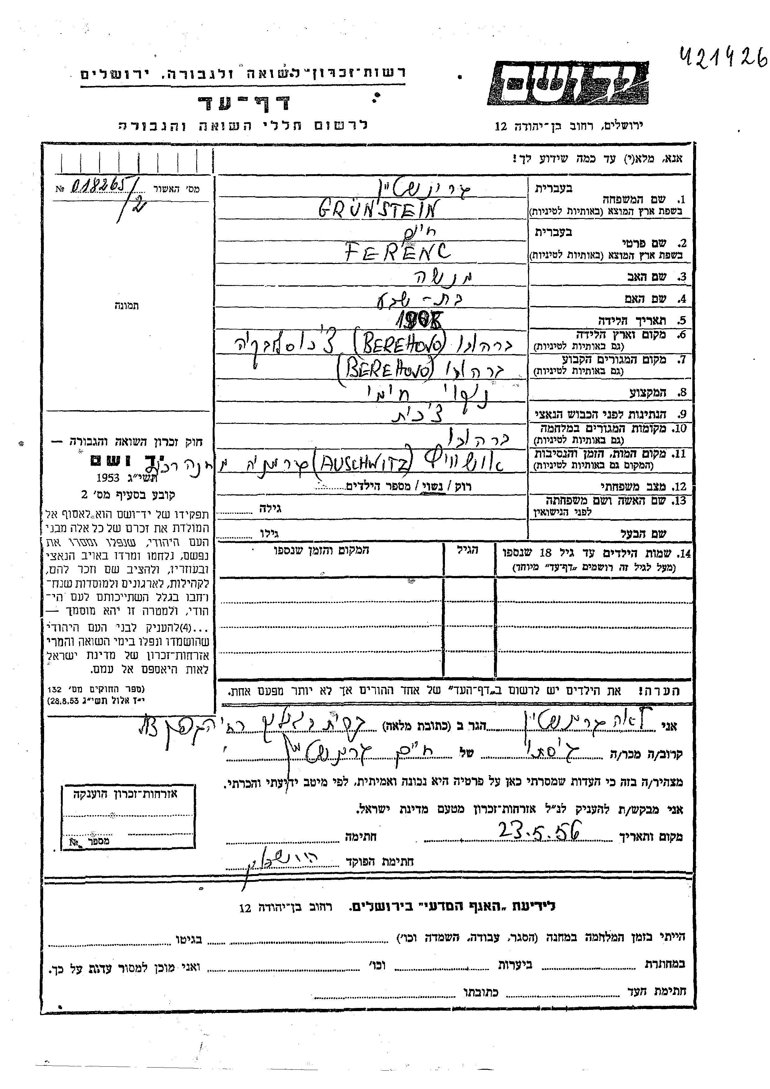 Ференц Хаим Грунштайн, место рождения: Берегово, Чехословакия. Отец: Неша, mать:Батшева. Владелец / работник химчистки. Женат / замужем. Место жительства до войны: Берегово, Чехословакия. Место во время войны: Берегово, Чехословакия.