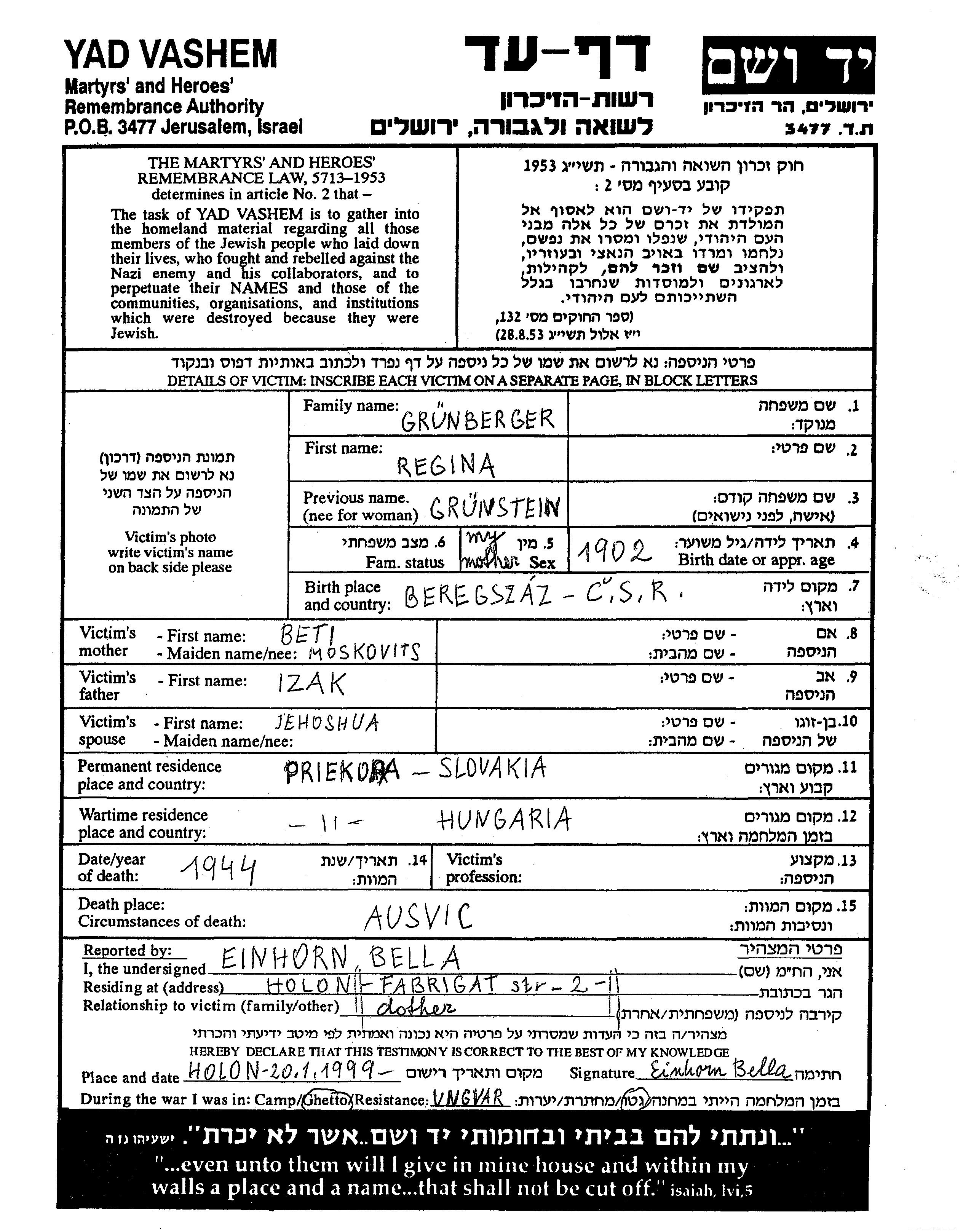 Регина Грунбергер, девичья фамилия Грунштайн, место рождения: Берегсас, Чехословакия. Отец: Изак, mать:Бети. Женат / замужем. Место жительства до войны: Прьекопа, Чехословакия. Место во время войны: Прьекопа, Чехословакия.