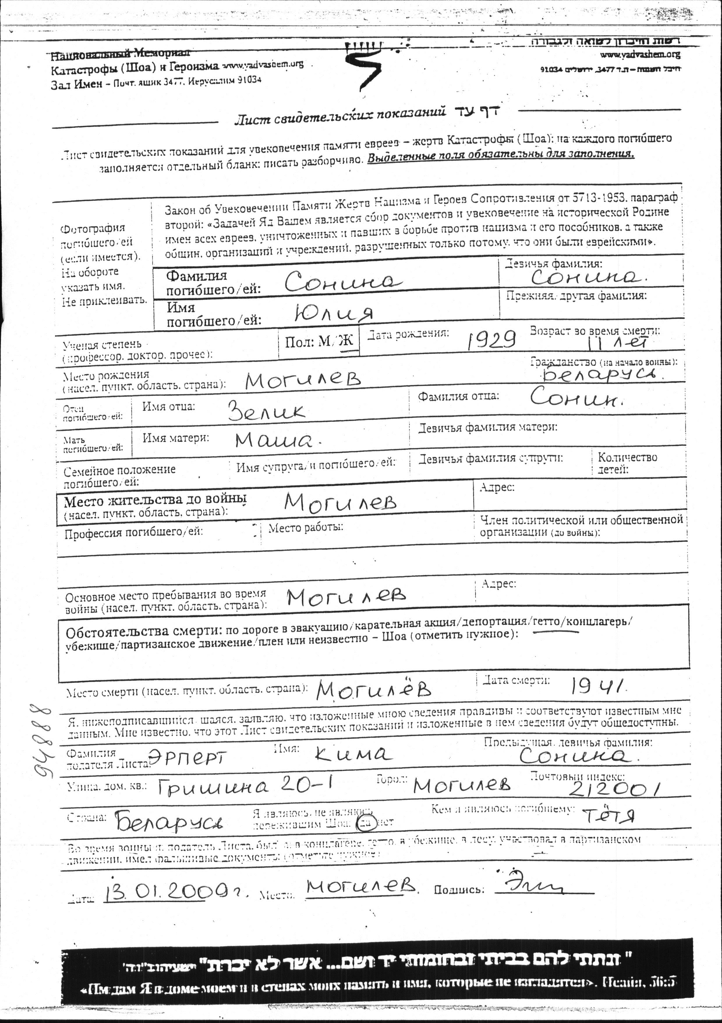 Сонина Юлия 1929 Могилёв, Белоруссия (СССР) Лист свидетельских показаний