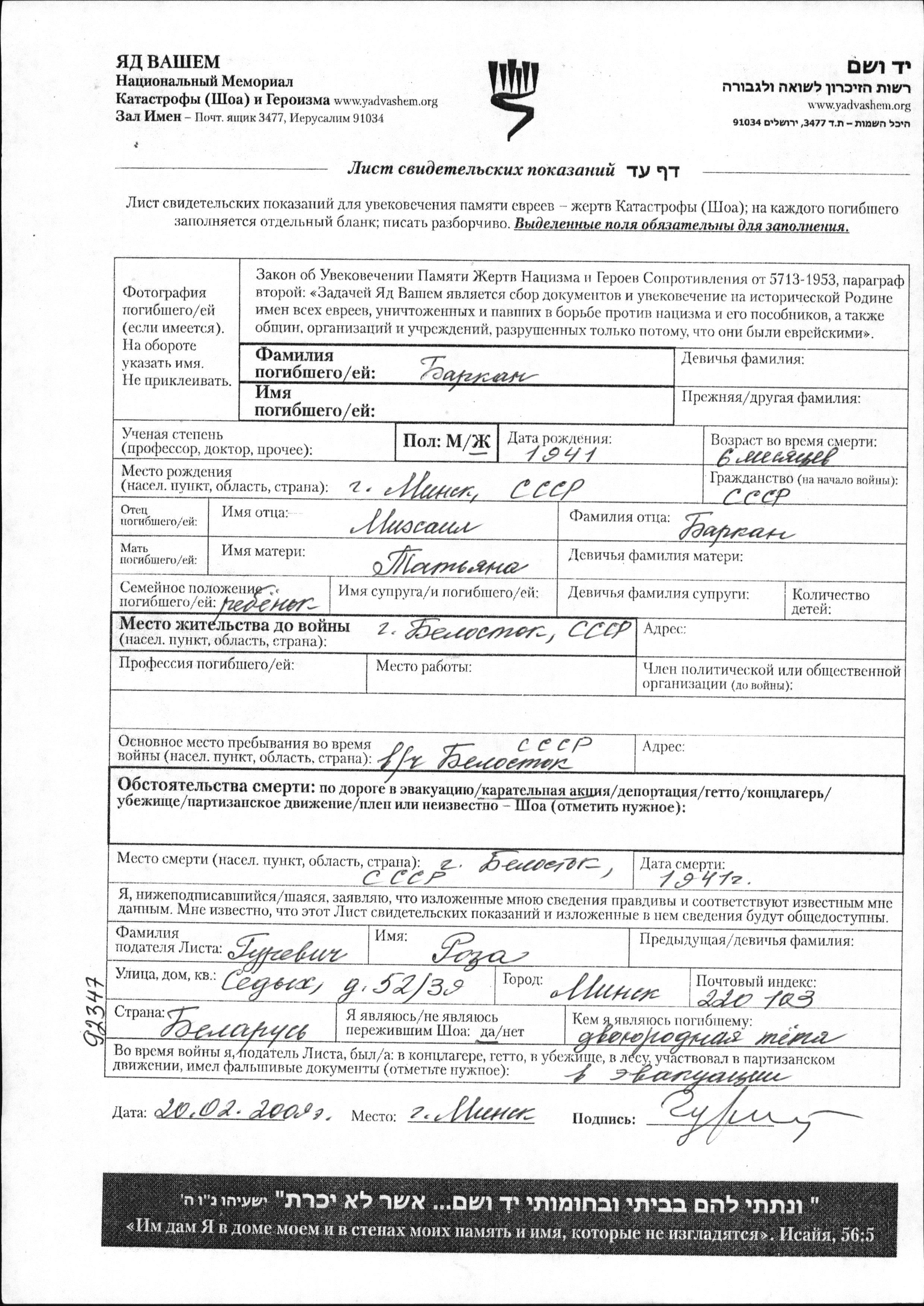 Баркан Имя неизвестно 1941 Белосток, Польша Лист свидетельских показаний