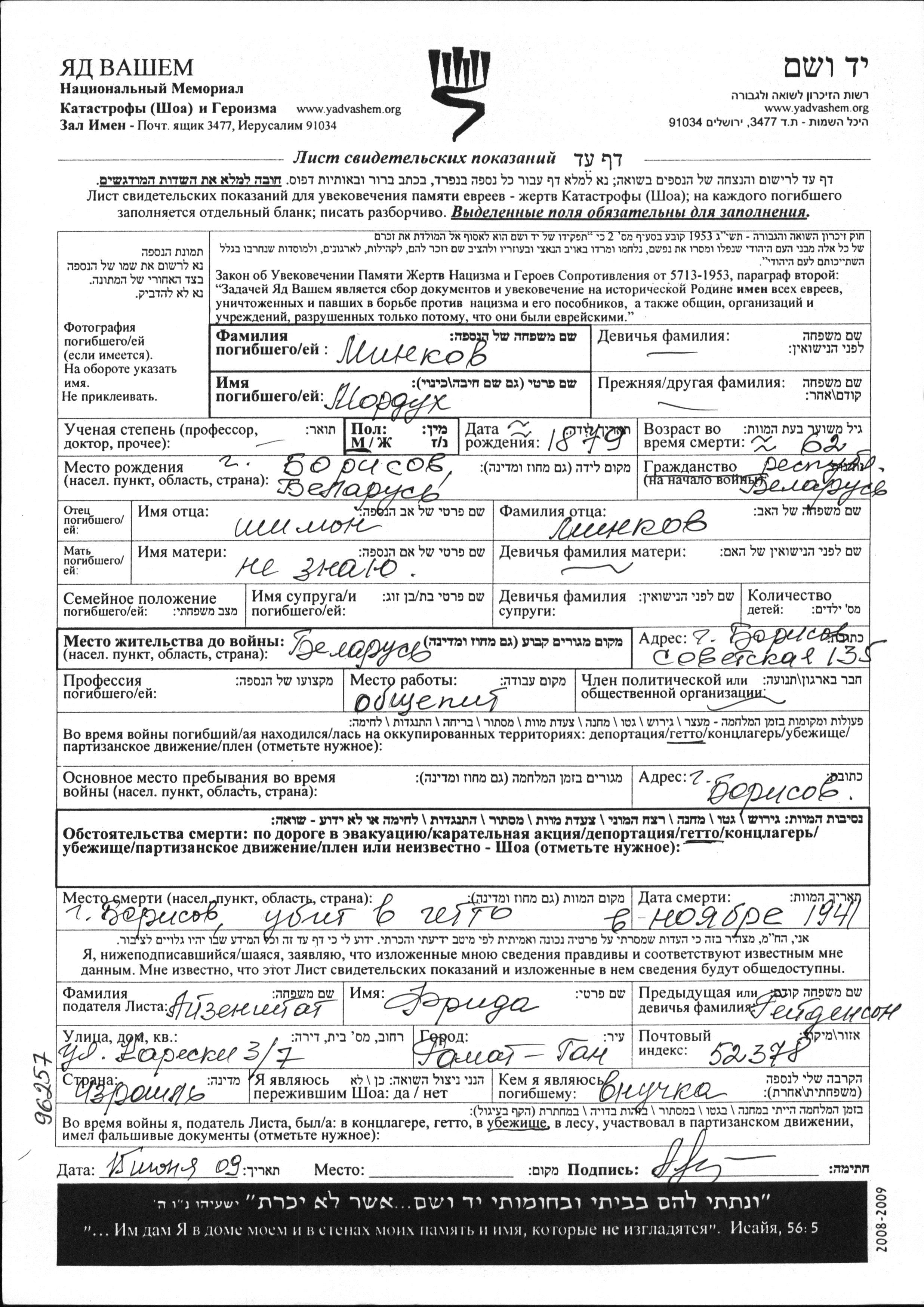 Яд Вашем - Листы свидетельских показаний Мемориального фонда
